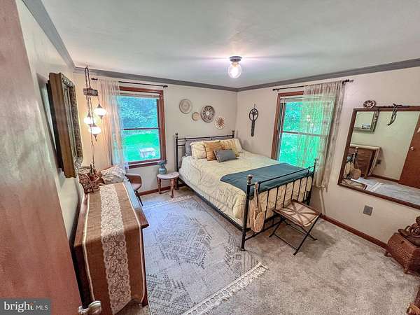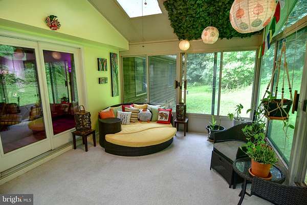 Situated on a long tree-lined driveway at the end of a private road, this two-level rancher is built on a 9.44 acre wooded lot on the east slope of Braddock Mountain, only ten minutes from shopping and dining in downtown Frederick, and hiking at Gambrill State Park. The main level includes a kitchen with solid cherry counters, and large east-facing windows with a view of the sunrise and nighttime views of the city lights, 700 feet below. The living room has a cozy propane fireplace, and two sunny offices fill out the living area. Symmetrical gigabit internet service is available, making this a perfect remote work retreat. A 15x12' gas heated sunroom is attached to the living room and rear deck, which wraps around half of the home! The home has a primary suite with large bathroom, plus two guest rooms that share a single full bath in the middle of the home. Warm wood trim and large entryways throughout compliment the home's forest setting. The lower level consists of a long garage that runs the full 52' length of the home, with built-in workbenches and heavy duty shelves. The remainder of the lower level includes a workshop, exercise space, and a high-end home theater, which is fully included at asking price. A roomy half bath is attached to the theater room, with space to add a shower. Home's website includes details of the theater room, as well as well water reports and other information. Storage space is plentiful, between the garage, several closets on the lower level, and a walk-up attic with full floor. The sloping, private lot is covered with mature hardwoods and a fire pit area, where you will spot deer, turkey, fox, and even the occasional black bear and bald eagle! A large parking area on the paved driveway has space for 6 cars. There is a deer-proof raised bed garden, and herb boxes scattered along the large wrap-around deck, along with a hot tub in a custom built surround.