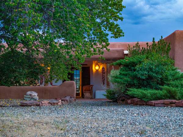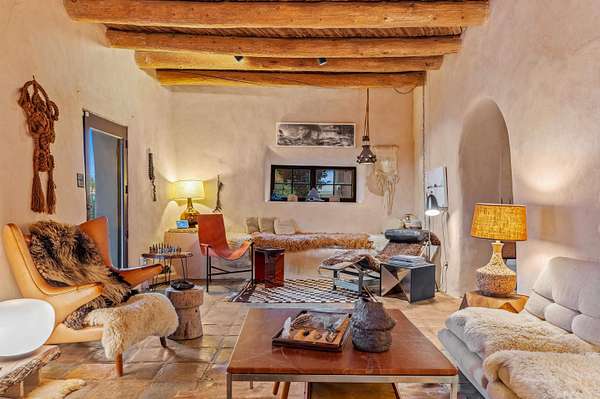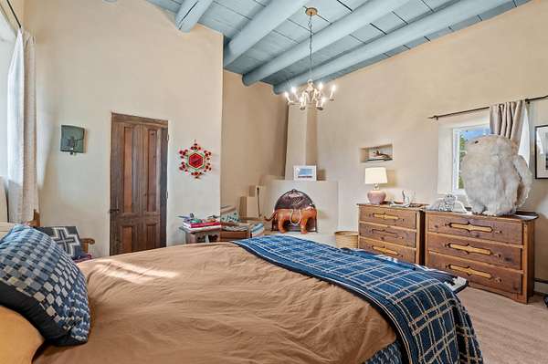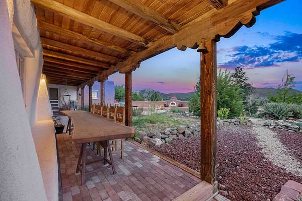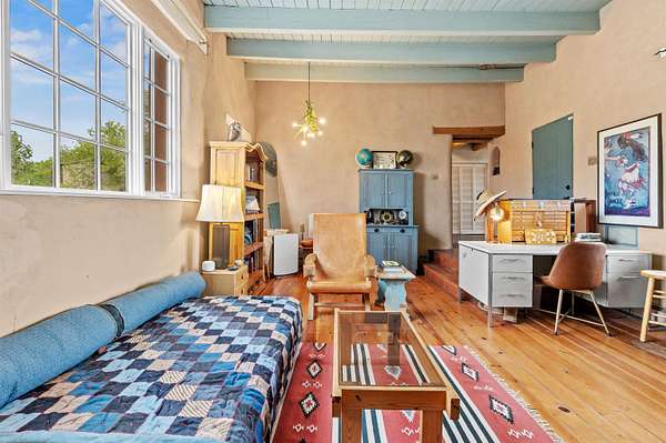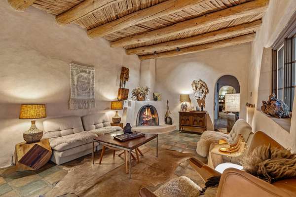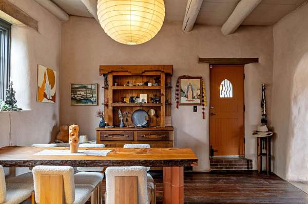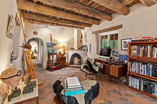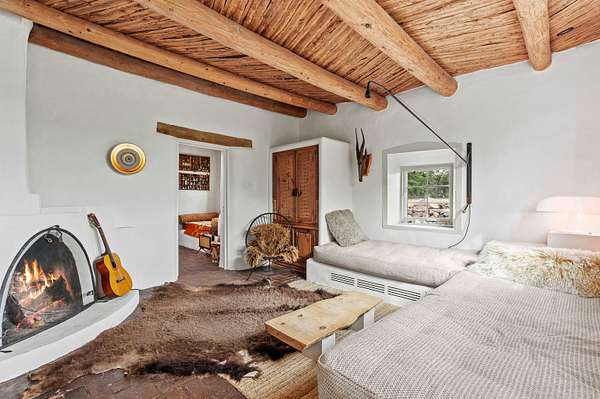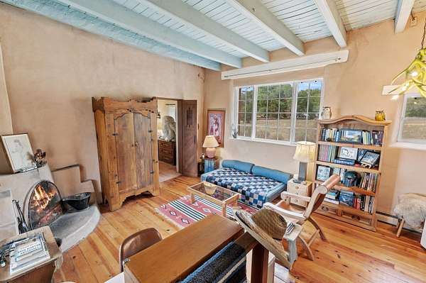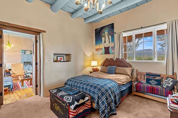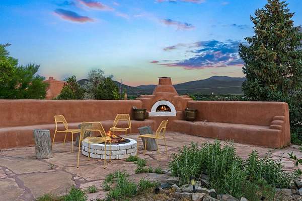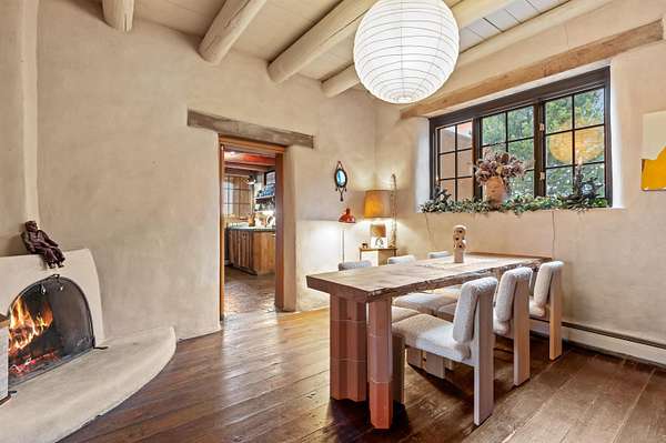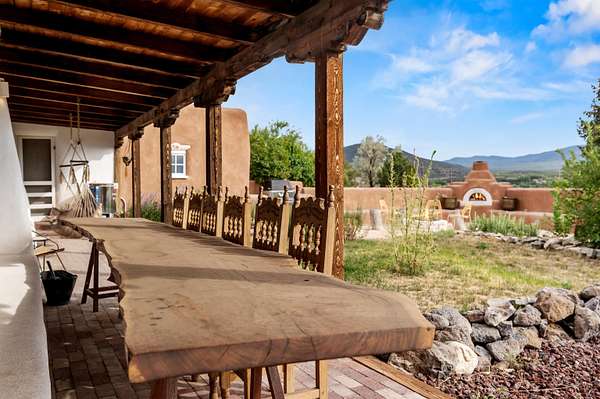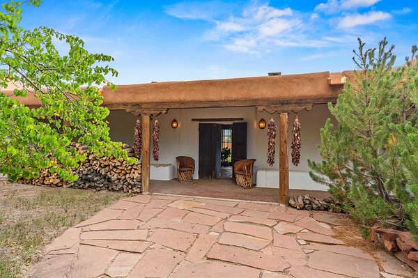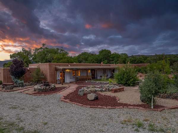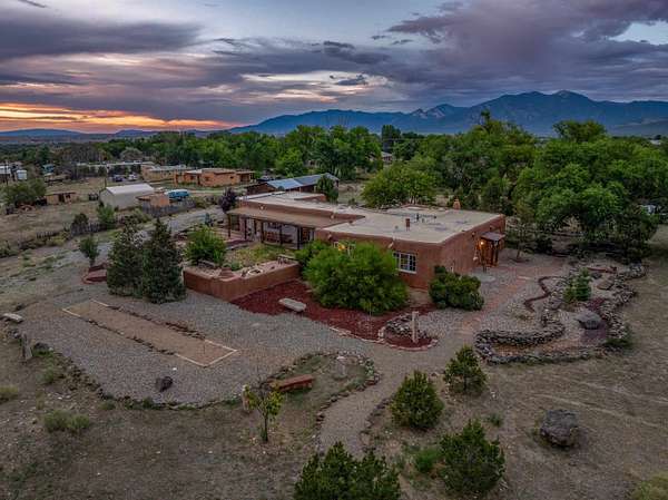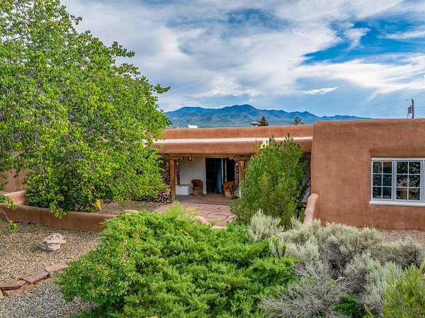Rich with artistic heritage and timeless New Mexico charm, this extraordinary 4.6-acre adobe compound in Ranchos de Taos blends historic soul, architectural authenticity, and modern comfort. Originally built in the 1830s and once home to renowned Modernist painter Andrew Dasburg, who lived and painted here from 1932 until his death in 1979. The main house features six kiva fireplaces, thick adobe walls, soft plaster finishes, archways, nichos, built-in bancos, and a variety of hand-crafted touches throughout. The property includes a 3-bedroom, 4-bath main home (approx. 3,120 square feet) and a separate 1-bedroom, 1.5-bath guest house (approx. 560 square feet), along with multiple outdoor living spaces, irrigation rights, and panoramic views of Taos Mountain and the surrounding ranges. The entryway welcomes with double doors, dark gray brick floors, and built-in bench seating. The kitchen showcases hand-tiled counters, herringbone-pattern brick floors, open shelving, a vintage gas range with hood, and exposed wood beams. A spacious coatroom/wet bar area includes cabinetry, countertop workspace, and a bar sink-perfect for welcoming guests in gracious style. Two dining rooms, both with lofted ceilings and fireplaces, offer flexibility for entertaining, working, or relaxing-one could be used as a bonus room (office, game room, whatever meets your needs!). The living room features Saltillo tile floors, viga and split cedar ceilings, an adobe fireplace, banco seating, and arched openings to adjacent spaces. A bright creative studio/workroom offers red brick floors, whitewashed wood ceilings, a kiva fireplace, and built-in work surfaces-ideal for artists, makers, or remote professionals. The primary suite includes a kiva fireplace, large window, generous nicho, and an ensuite bath. Each additional bedroom has unique character and layout, with custom ceilings, natural light, and warm details. Bathrooms throughout the home are rich in texture and color, with hand-tiled counters, artisan sinks, Saltillo tile, and updated fixtures. The guest house, formally Dasburgs painting studio, is full of charm, with a spacious living room featuring lofted ceilings, wood floors, perfect light coming in from a large north-facing window, custom wood doors, and a kiva fireplace. The guest bedroom includes an ensuite half bath, kiva fireplace, carpet, and large nicho. A hallway with built-in storage and red brick floors leads to a full bath with beautiful artisan tile and a tub/shower combo. The guest kitchen includes red brick floors, a gas range, refrigerator, dishwasher, and a large window above the sink. Outdoor living takes center stage, with a deep covered portal running the length of the home, decorative carved wood supports, red brick flooring, hammock swings, and multiple areas to dine or lounge. The beautifully landscaped backyard includes flowering garden beds, defined grassy areas, extensive rock work, xeriscaping and a spectacular outdoor seating area complete with a large kiva fireplace, curved banco seating, and a flagstone patio with a built-in firepit-perfect for evening gatherings under the stars. Additional features include irrigation rights from the local acequia system, detached 2-car carport, a storage shed, a horseshoe pit, mature trees and native plantings, and perimeter fencing for privacy and pets. Located just minutes from the plaza yet offering a peaceful, rural feel, this rare and versatile property combines artistic history with timeless style and practical amenities. Whether you're seeking a full-time residence, a creative retreat, or a legacy compound, 7236 Highway 518 offers a uniquely Taos experience, where beauty, history, and functionality come together. MAIN HOUSE MATTERPORT | GUEST HOUSE MATTERPORT | CUSTOM VIDEO