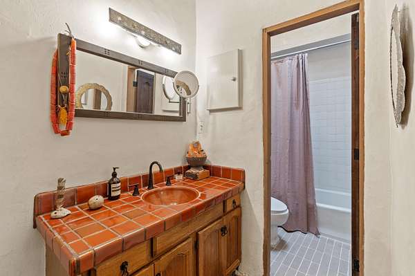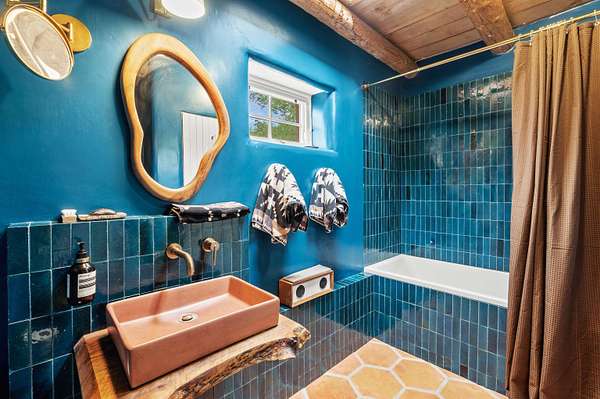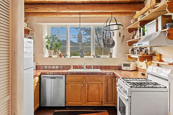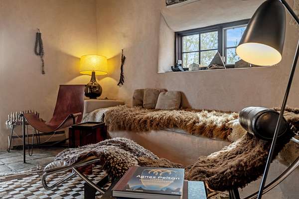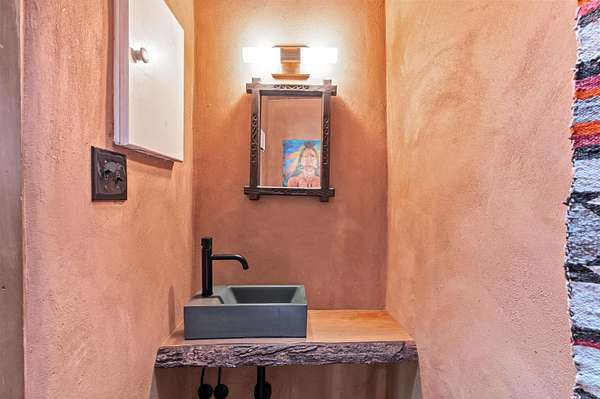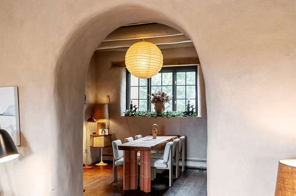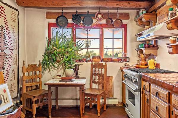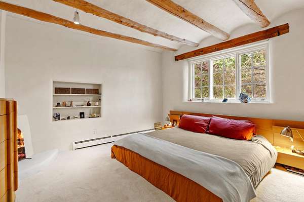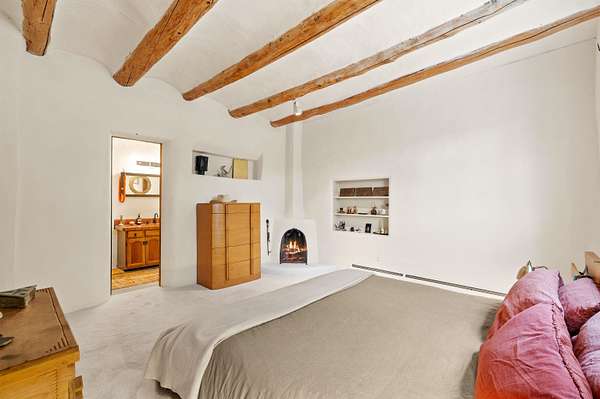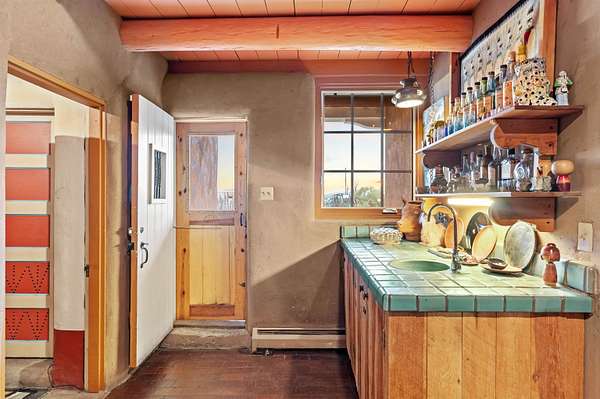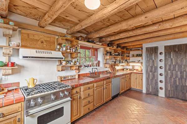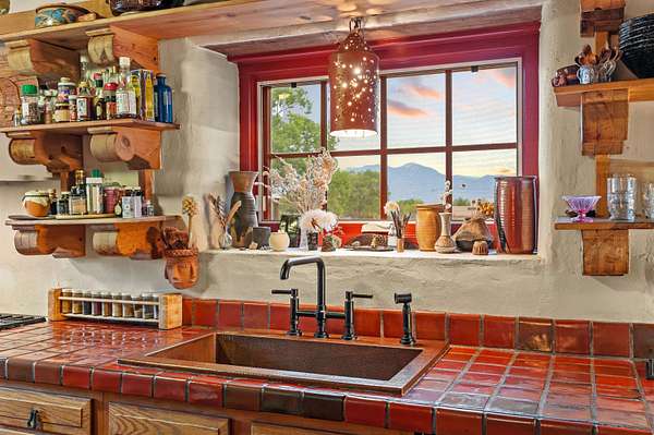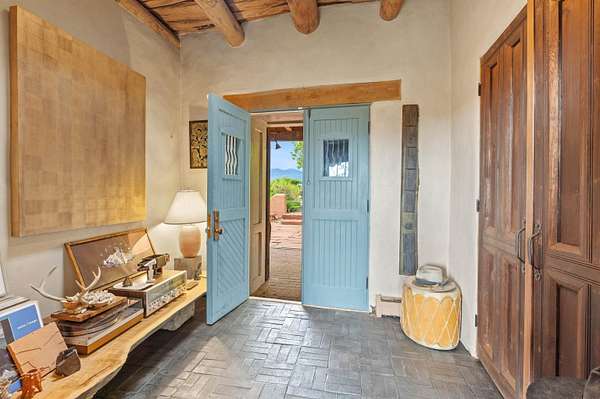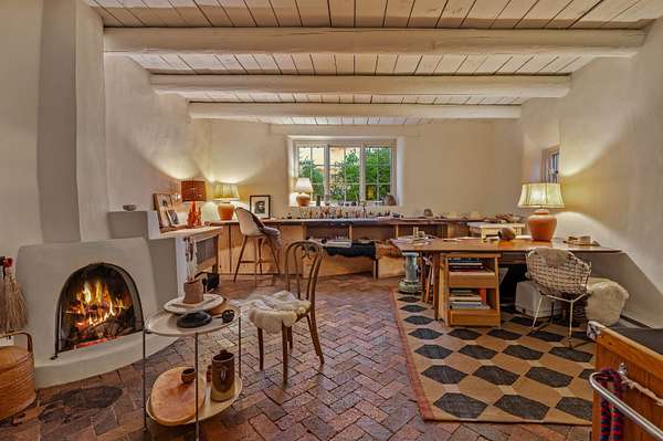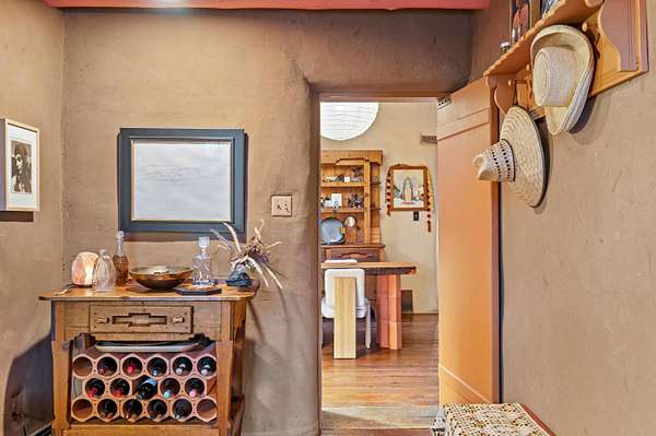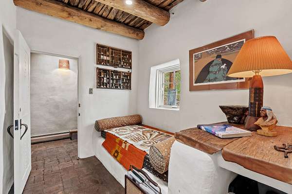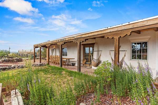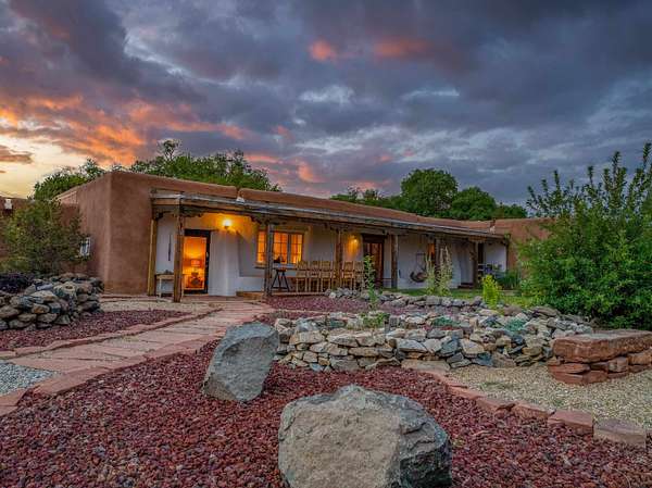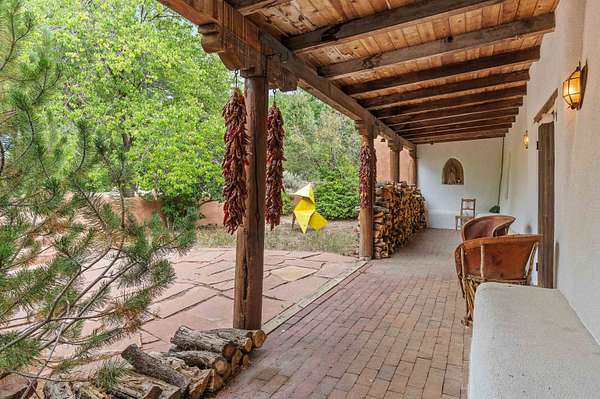 Rich with artistic heritage and timeless New Mexico charm, this extraordinary 4.6-acre adobe compound in Ranchos de Taos blends historic soul, architectural authenticity, and modern comfort. Originally built in the 1830s and once home to renowned Modernist painter Andrew Dasburg, who lived and painted here from 1932 until his death in 1979. The main house features six kiva fireplaces, thick adobe walls, soft plaster finishes, archways, nichos, built-in bancos, and a variety of hand-crafted touches throughout. The property includes a 3-bedroom, 4-bath main home (approx. 3,120 square feet) and a separate 1-bedroom, 1.5-bath guest house (approx. 560 square feet), along with multiple outdoor living spaces, irrigation rights, and panoramic views of Taos Mountain and the surrounding ranges. The entryway welcomes with double doors, dark gray brick floors, and built-in bench seating. The kitchen showcases hand-tiled counters, herringbone-pattern brick floors, open shelving, a vintage gas range with hood, and exposed wood beams. A spacious coatroom/wet bar area includes cabinetry, countertop workspace, and a bar sink-perfect for welcoming guests in gracious style. Two dining rooms, both with lofted ceilings and fireplaces, offer flexibility for entertaining, working, or relaxing-one could be used as a bonus room (office, game room, whatever meets your needs!). The living room features Saltillo tile floors, viga and split cedar ceilings, an adobe fireplace, banco seating, and arched openings to adjacent spaces. A bright creative studio/workroom offers red brick floors, whitewashed wood ceilings, a kiva fireplace, and built-in work surfaces-ideal for artists, makers, or remote professionals. The primary suite includes a kiva fireplace, large window, generous nicho, and an ensuite bath. Each additional bedroom has unique character and layout, with custom ceilings, natural light, and warm details. Bathrooms throughout the home are rich in texture and color, with hand-tiled counters, artisan sinks, Saltillo tile, and updated fixtures. The guest house, formally Dasburgs painting studio, is full of charm, with a spacious living room featuring lofted ceilings, wood floors, perfect light coming in from a large north-facing window, custom wood doors, and a kiva fireplace. The guest bedroom includes an ensuite half bath, kiva fireplace, carpet, and large nicho. A hallway with built-in storage and red brick floors leads to a full bath with beautiful artisan tile and a tub/shower combo. The guest kitchen includes red brick floors, a gas range, refrigerator, dishwasher, and a large window above the sink. Outdoor living takes center stage, with a deep covered portal running the length of the home, decorative carved wood supports, red brick flooring, hammock swings, and multiple areas to dine or lounge. The beautifully landscaped backyard includes flowering garden beds, defined grassy areas, extensive rock work, xeriscaping and a spectacular outdoor seating area complete with a large kiva fireplace, curved banco seating, and a flagstone patio with a built-in firepit-perfect for evening gatherings under the stars. Additional features include irrigation rights from the local acequia system, detached 2-car carport, a storage shed, a horseshoe pit, mature trees and native plantings, and perimeter fencing for privacy and pets. Located just minutes from the plaza yet offering a peaceful, rural feel, this rare and versatile property combines artistic history with timeless style and practical amenities. Whether you're seeking a full-time residence, a creative retreat, or a legacy compound, 7236 Highway 518 offers a uniquely Taos experience, where beauty, history, and functionality come together. MAIN HOUSE MATTERPORT | GUEST HOUSE MATTERPORT | CUSTOM VIDEO