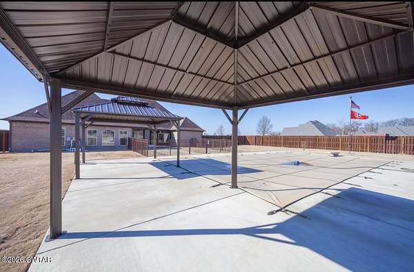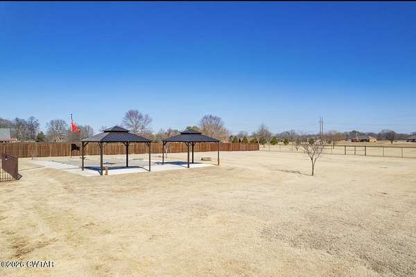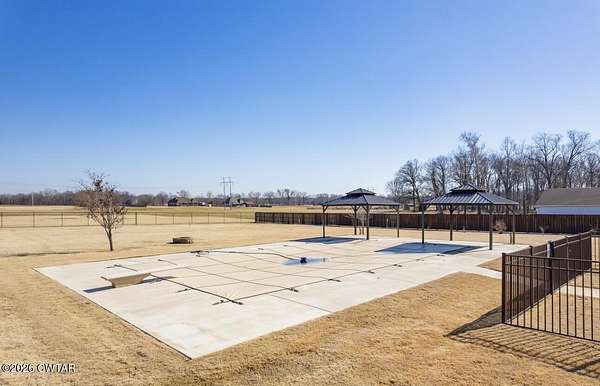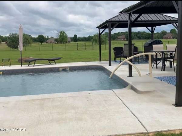 Step into your own private outdoor retreat on just under 4 beautifully maintained acres. The backyard features approx. 150' x 200' of fenced area designed for entertaining and everyday enjoyment, featuring an in ground saltwater swimming pool installed in Fall 2024 with expanded concrete decking for generous gathering space. The custom concrete includes four built in umbrella holders, creating flexible shaded seating areas around the pool. Two gazebos overlook the pool area and are equipped with eight power outlets, making them ideal for outdoor dining, game days, evening lighting, or hosting events. The expansive yard offers room to play, garden, or simply enjoy the privacy and open space. Inside, the home offers 5 bedrooms and 4 full baths with tile flooring throughout. The kitchen provides abundant cabinetry, a double pantry, an eat in area, and a separate dining room. Just off the primary suite is a heated and cooled enclosed patio/sunroom for year round relaxation. The insulated garage includes a new HVAC unit and a storm shelter/safe room. A new roof was installed in December 2025 for added peace of mind. If outdoor living is at the top of your list, this property delivers space, function, and resort style amenities all in one. The information provided in this listing is deemed to be accurate and reliable, but it is not guaranteed by the broker or agent.