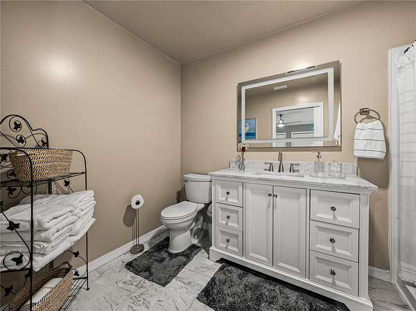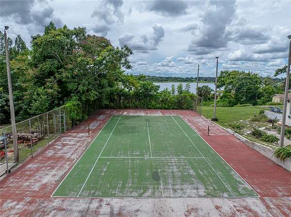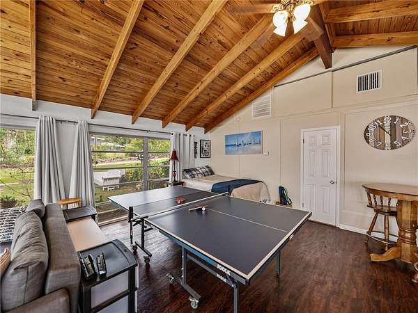 In addition to the main home, the property includes a versatile guest dwelling with multiple rental options: a fully furnished studio apartment upstairs, a 2 bedroom/1 bath apartment downstairs, plus a shared recreation room complete with a sitting area, ping pong, pool table, sauna, full bath, and an open patio overlooking the lake and tennis court.