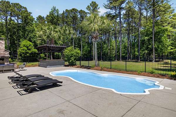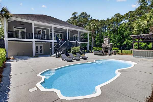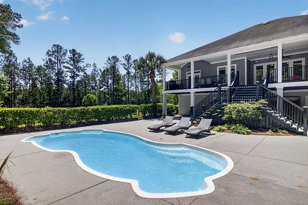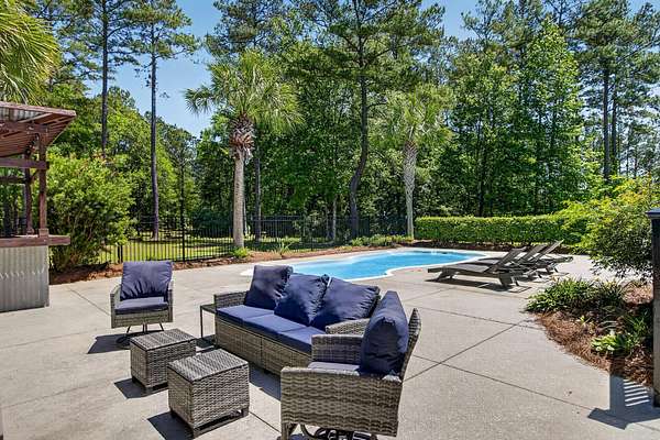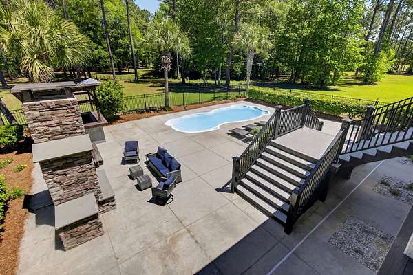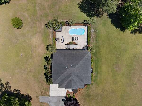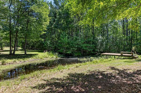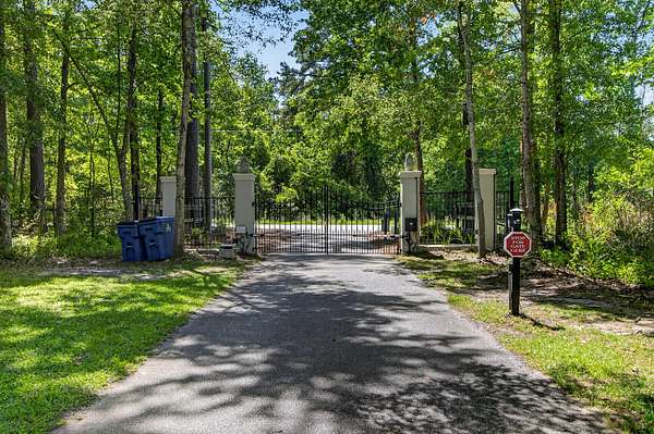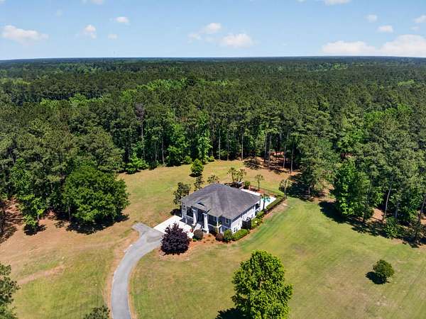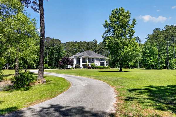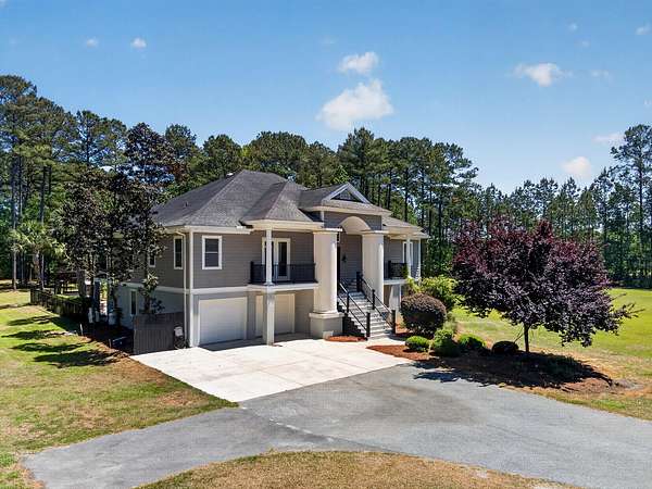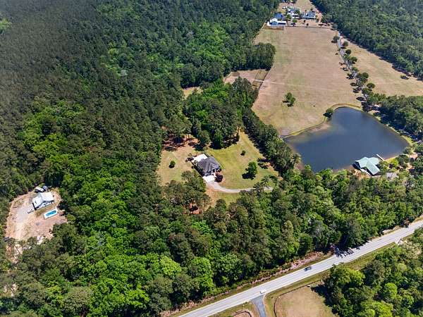 Tucked away on 10 private acres, this custom-built executive home offers the rare combination of peaceful seclusion and everyday convenience--just a short drive to town while feeling worlds away. With over 7 acres cleared, the entire property fenced, and a private electric security gate at the entrance, this estate is designed for those who value space, privacy, and the freedom to truly enjoy both. A picturesque 1/2-acre pond with a dock adds to the setting, while the outdoor living spaces create a true resort-style experience. The inground pool area is the centerpiece of the backyard, complete with a tiki bar, covered outdoor shower, grill area, and a newly added outdoor fireplace--perfect for gathering year-round and extending evenings under the stars. Stretching the entire length of the back of the home, the expansive covered porch is one of the property's most impressive features. Double French doors from the living room create a seamless transition to this incredible outdoor living space, where peaceful views of the pool, pond, and surrounding acreage create the perfect private retreat. Designed for both relaxing and entertaining, the porch easily accommodates multiple seating and dining areas while allowing you to enjoy the beauty and privacy of the land from every angle. Inside, quality craftsmanship and thoughtful design are evident throughout. Brazilian cherry floors run across the main living areas, while soaring 17-foot ceilings in the great room create a dramatic yet inviting space. The open-concept layout connects the great room to the custom kitchen and formal dining room, creating a warm, functional space for everyday living and entertaining. The kitchen also features a spacious eat-in area, offering plenty of room for casual dining and giving flexibility for the formal dining room to easily serve as a home office, sitting room, or additional flex space if desired. The dining room features 8-foot French doors that open to the front porch, adding even more charm and natural light to the home. Designed with a desirable split floor plan, the primary suite offers both privacy and comfort. The spacious primary bedroom opens directly to the expansive back porch through French doors and features separate his-and-hers custom closets. The primary bath includes dual vanities, a large walk-in tiled shower, and a jetted jacuzzi tub for a true spa-like retreat. The two additional generously sized bedrooms are both ensuite, each with its own private bathroom and French doors leading to outdoor porch spaces--one opening to its own private front porch area and the other to the back porch--creating the perfect setup for family or guests. The lower level is currently designed as an impressive media and entertainment space, complete with a wet bar, a full bathroom, and a large gathering area centered on the built-in projection screen. This flexible space could easily serve as an in-law suite, with a hallway leading to additional garage space that could be framed for a fourth bedroom. The lower level also opens to a covered outdoor area currently used for grilling, offering the perfect opportunity for a secondary private patio space ideal for extended family or guests. Additional features include a drive-under garage with room for up to four cars parked tandem, a large detached shed with covered drive-under storage on the side of the property, two irrigation systems servicing the land, fiber optics run to the house, system in place to treat well water, wet bar features reverse osmosis, and thoughtful custom details throughout that make this home as functional as it is impressive. This is more than a home--it is a private retreat designed for entertaining, relaxing, and enjoying the best of Lowcountry living.