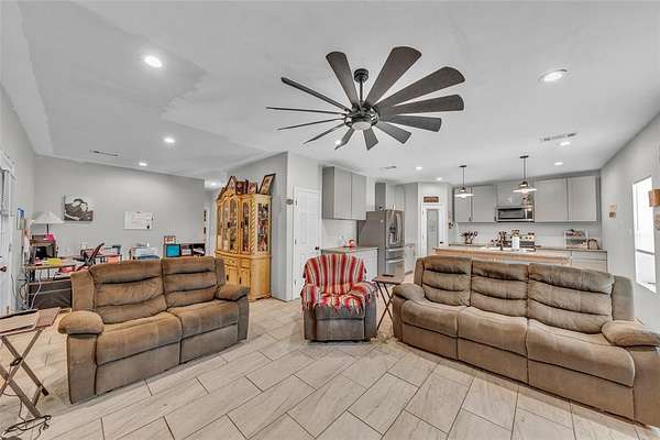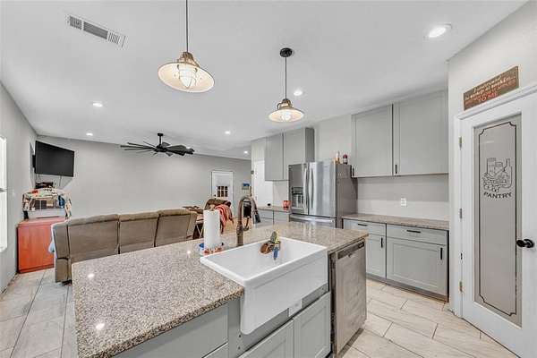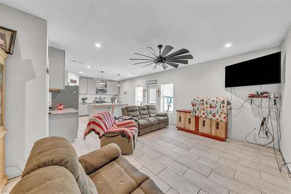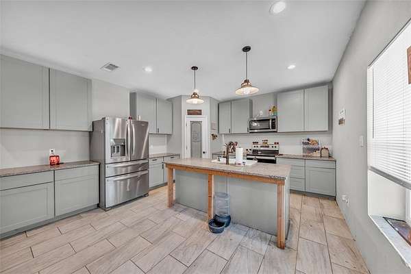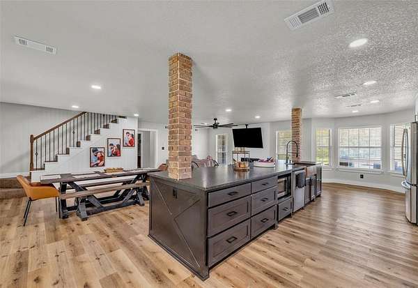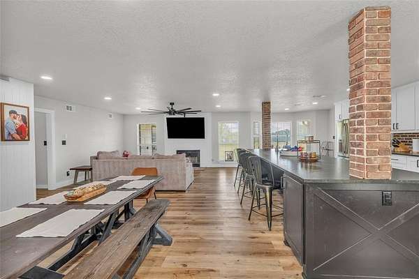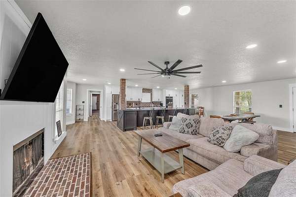 Start your mornings with a hot cup of coffee on the expansive, covered front porch with rich cedar beams, soaking in serene country views and Texas sunrises. Inside the beautifully renovated 5-bedroom, 2.5+ bathroom home, you'll find a spacious open-concept layout with luxury vinyl plank flooring, a cozy fireplace, and natural light pouring through large windows. The stunning chef's kitchen features a massive center island, quartz-style countertops, stainless steel appliances, double ovens, custom cabinetry, and exposed brick accents--ideal for entertaining and everyday living.
