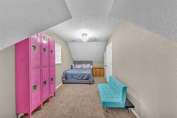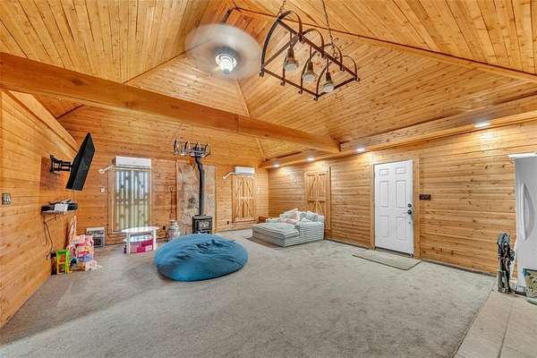 The expansive game room boasts warm wood finishes, vaulted ceilings, and a wood-burning stove, providing the ultimate relaxation or play space.