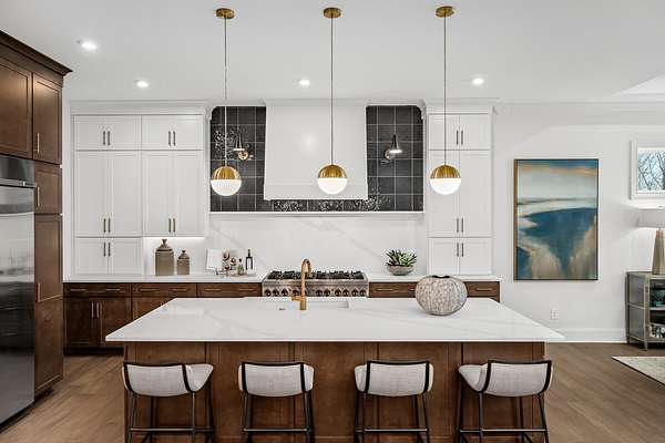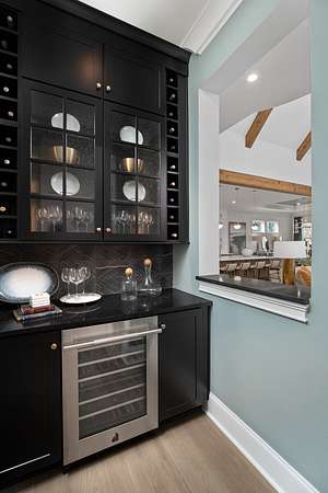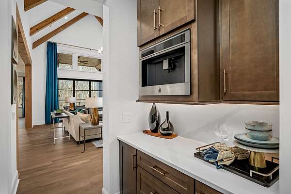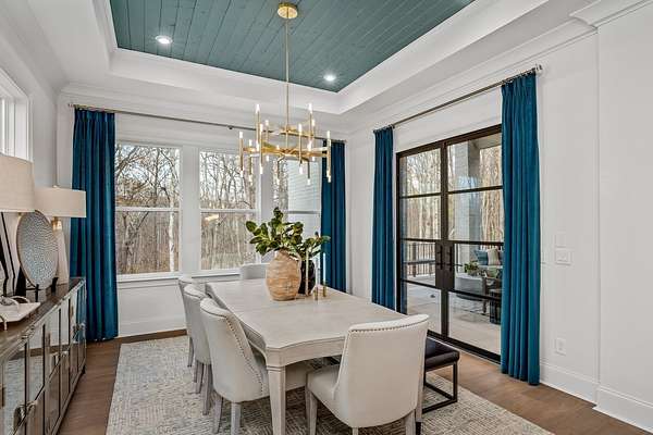The gourmet kitchen is a chef's dream, featuring high end appliances, a large island, and extensive cabinetry. A true one of a kind with a formal dining room, butler's pantry and optional wine bar adjacent to the expansive guest suite, all located on the main level. The luxury primary suite is a private retreat with vaulted ceilings and optional wood beams, complete with an oversized shower and soaking tub, dual walk in closets, and serene views of the wooded homesite.