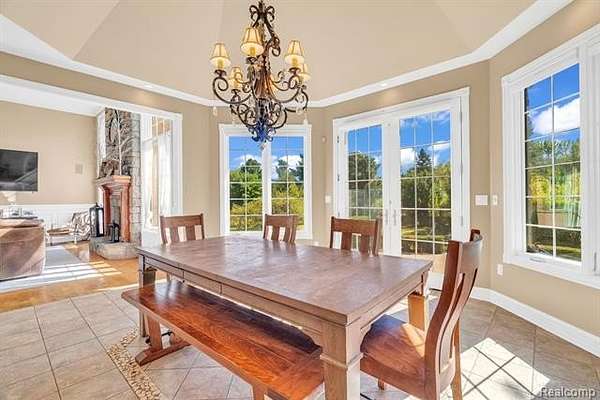 Step into the inviting foyer, framed by French doors leading to a library or home office. The spacious great room features a cozy fireplace and expansive windows that fill the space with natural light and stunning backyard views.