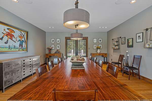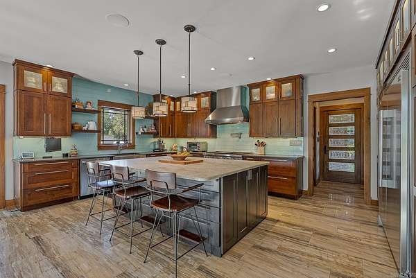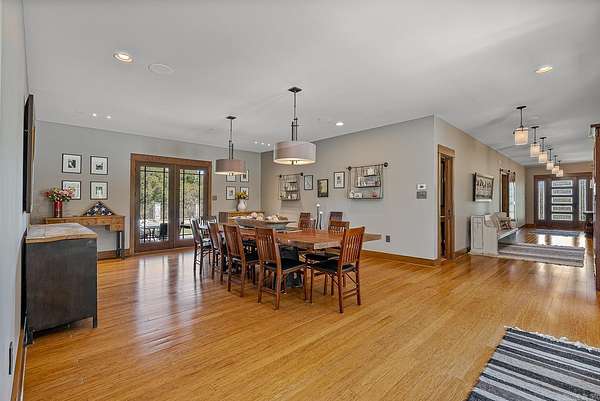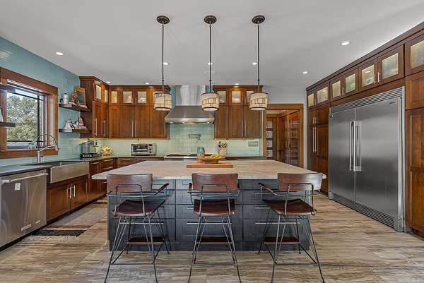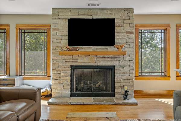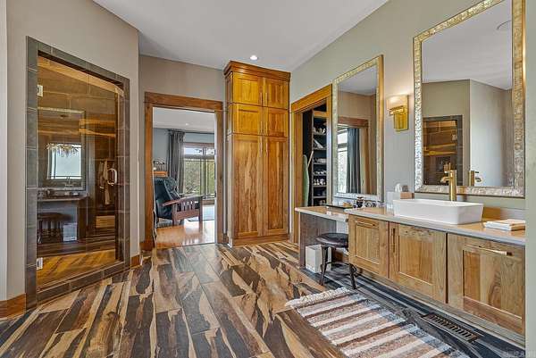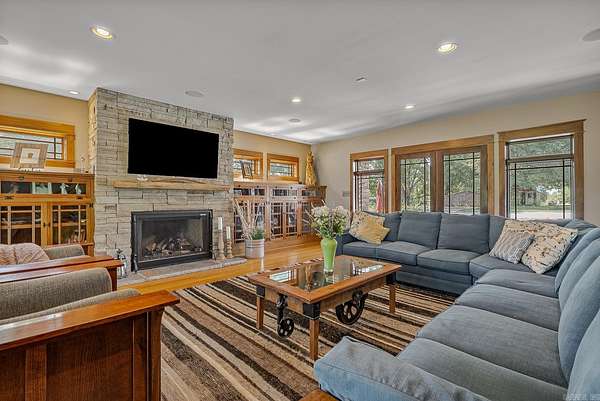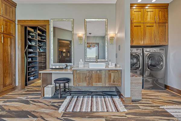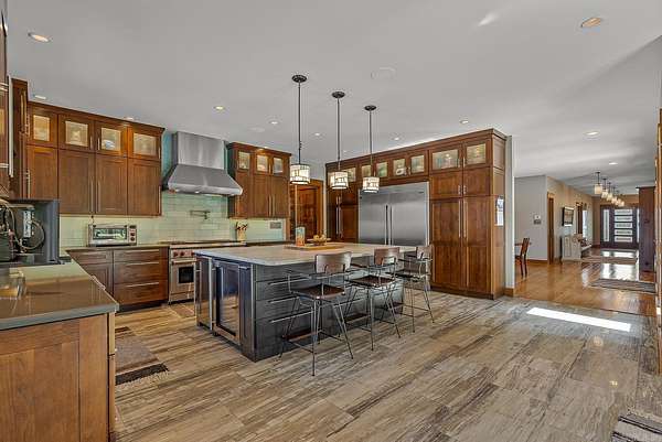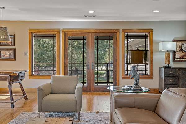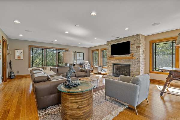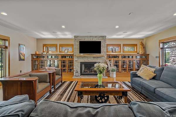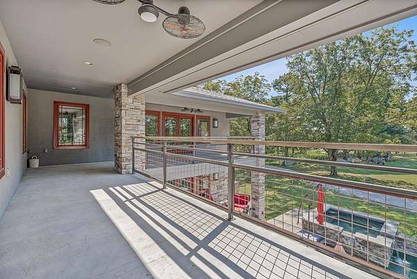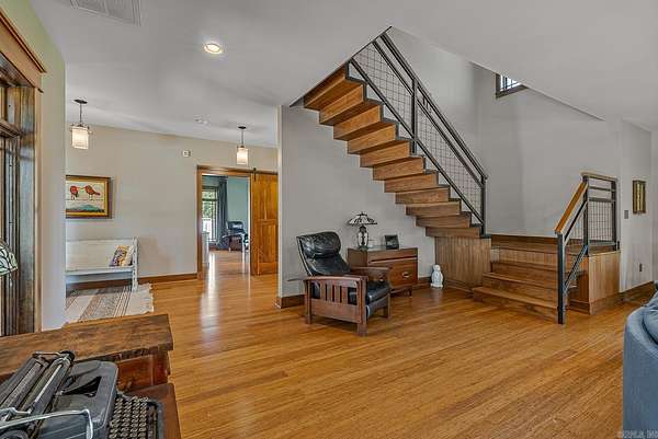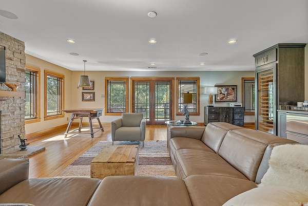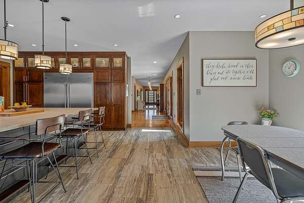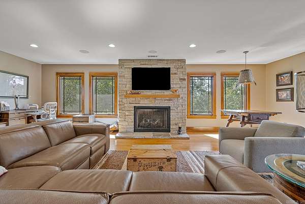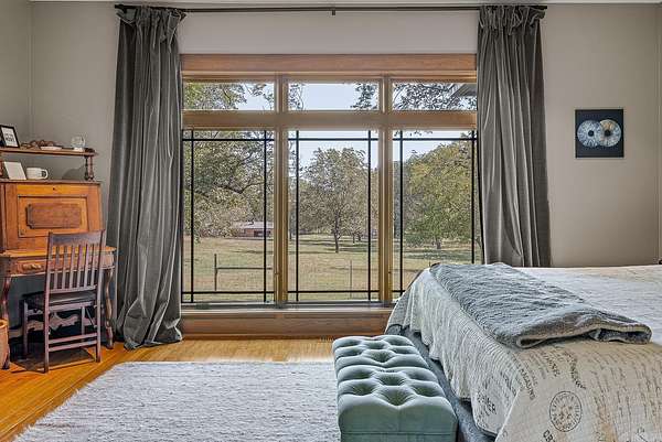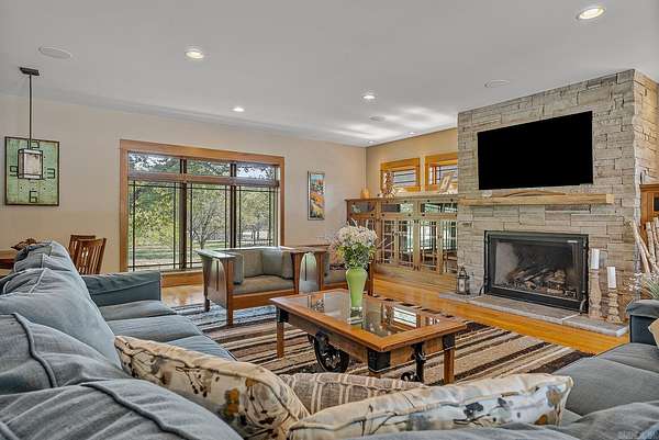 Set on 26 scenic acres, this stunning modern prairie-style home is a showcase of craftsmanship, detail, and timeless beauty. Every element was thoughtfully designed--from the milled black walnut trim to the heated tile floors and inviting wood-burning fireplace. The gourmet kitchen impresses with quartzite and Corian countertops, an oversized island, double fridge, warming drawer, pantry freezer, and crushed ice maker. The primary suite offers radiant heat floors, a soaker tub, dual sinks, an in-suite washer and dryer, and a spacious custom closet. A floating steel-framed staircase highlighted by a stained-glass chandelier leads to a second living space with fireplace and a full bar featuring a wine cooler, sink, and ice maker. The fully finished heated and cooled garage also includes a snow-melt system. Outside, enjoy a resort-style inground pool with spillover spa, a two-bedroom guest house with full kitchen and dual living areas, a large shop, and a picturesque pond with fountain--an extraordinary blend of luxury, comfort, and craftsmanship.