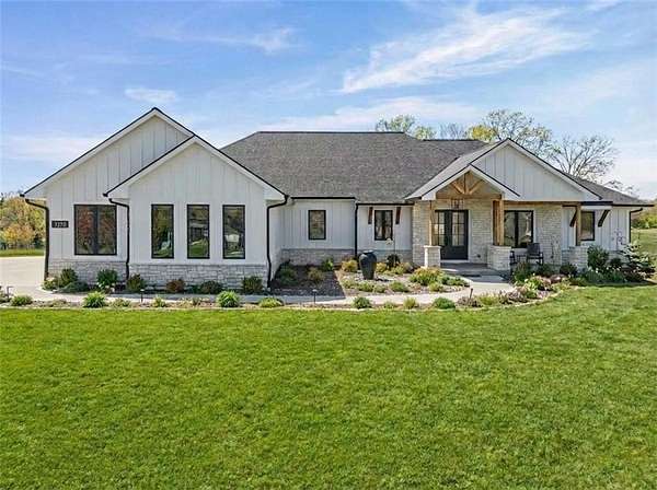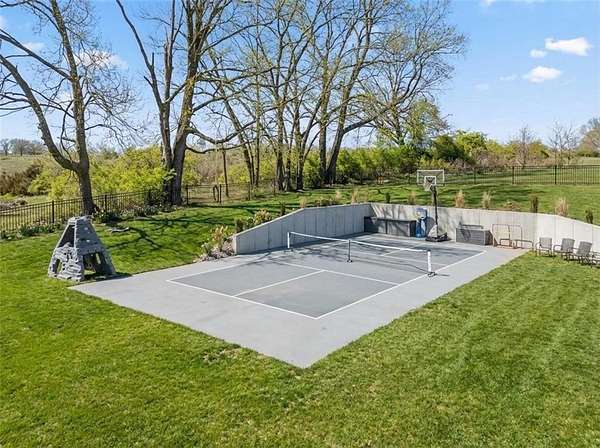 TRUE RANCH FLOORPLAN WITH 5 --- YES 5 BEDROOMS ON THE MAIN LEVEL + OFFICE !!!!!!! True ranch home features 5 bedrooms on the main floor. Primary suite is totally separate from the family bedrooms. CUSTOM DESIGNED FOR THE BUILDER AND HIS FAMILY. This home is where everyione will want to be as the entertaining potential is unbelievable. YOU HAD ME AT PICKLEBALL !!!! YES ...THERE IS A PICKLEBALL / SPORT COURT IN THE BACK YARD. The view is amazing from a taller elevation than most of the homesites and adds lots of privacy. Long driveway takes you to the side entry 3 car garage. The drop space and laundry room are spectacular. Custom 8 ft double entry doors into the main foyer with office on the right and you will be absorbed by the magnificent fireplace, shelving and decor. Upon entering you will see beautiful white oak floors, leading you to the vaulted and beamed great room and open kitchen & dining area. Quartz countertops, private butlers pantry with so many extras .. beverage fridges And a water bottle filler! The primary suite has its own fireplace with beautiful stone floor to ceiling, with built-in storage benches to either side. Primary bath is everything you could want! There will be many great memories o recreation room, 2nd kitchen/ bar, family room area and so much space to work or play. The 6th bedroom suite along with workout or potential indoor outdoor room with the roll up garage door is amazing!