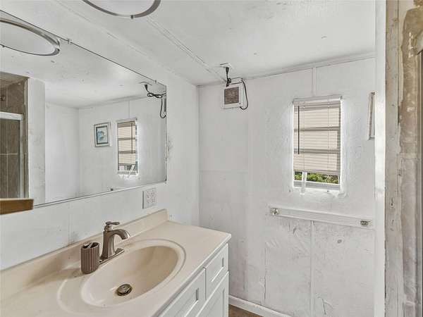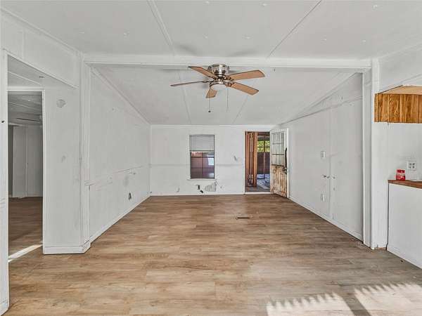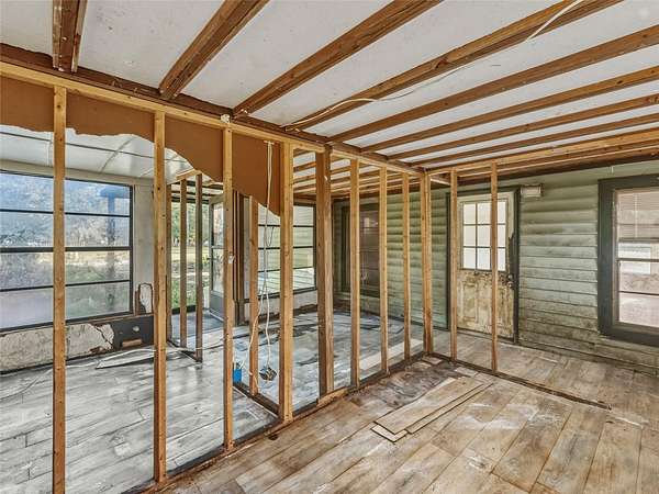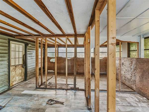 The home includes an open living area, a large enclosed front porch that serves as bonus living space, and a rear porch with a half bath and shower convenient for outdoor use. Portions of the property show unfinished areas and will require some rehabilitation, making this a strong opportunity for investors or buyers looking to renovate and customize.