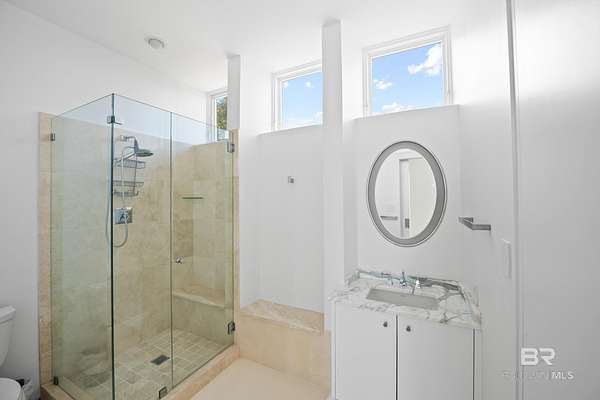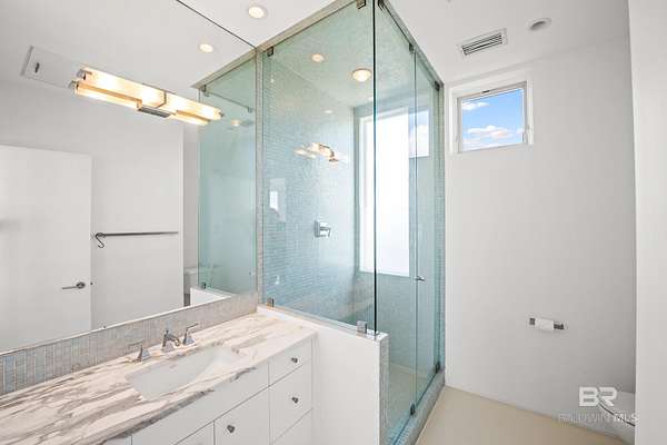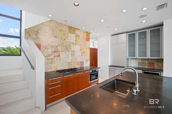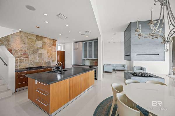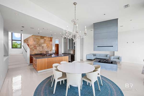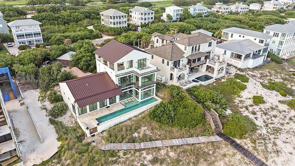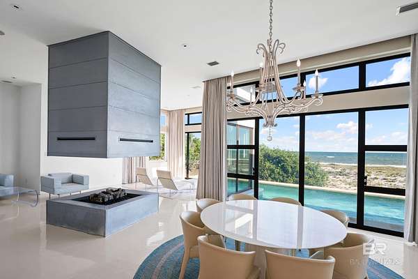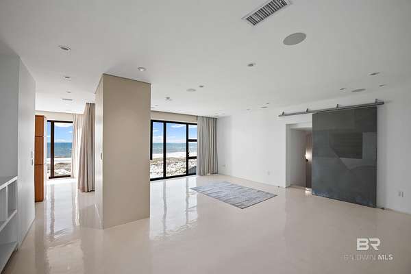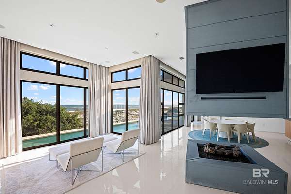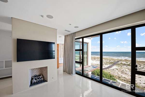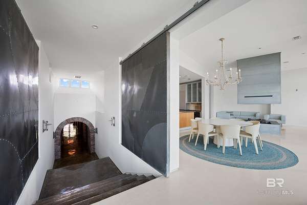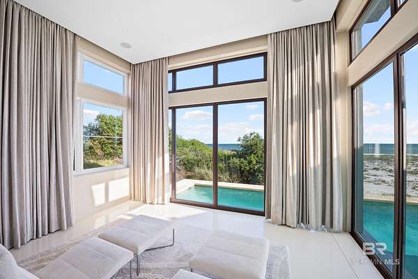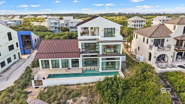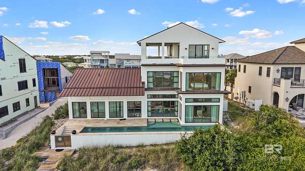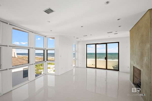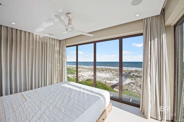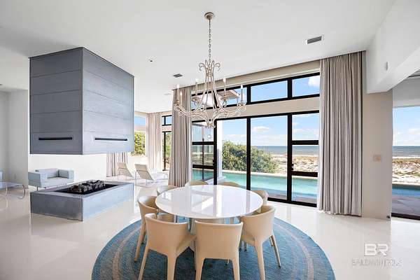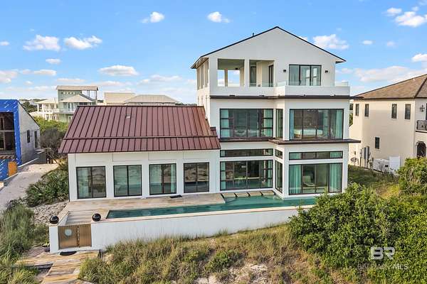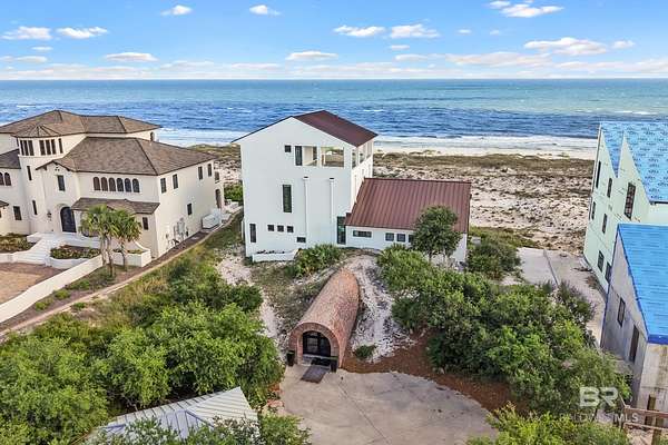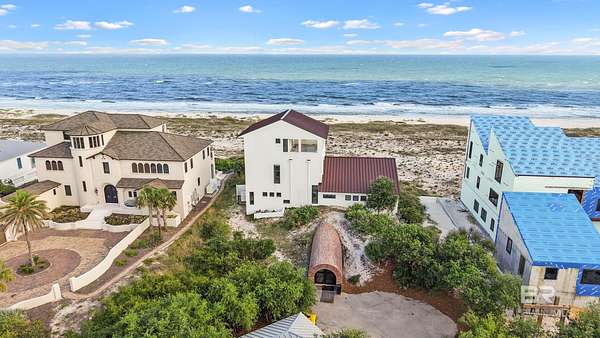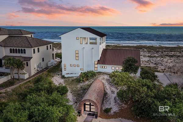 Kiva Dunes Gulf Front Modern Work of Art atop 25 foot dune. The builder, Joe Noah of Noah and Associates, had to move that dune, weighing hundreds of tons, construct an intricate fifty-foot brick tunnel, put the sand dune back over it and re-plant native vegetation. "It's a modern house with extraordinary features " Noah says. Summerour designed the residence to be built into the land; unique to that spot. His architecture gives permanence and warmth to the home's state-of-the-art, modern construction. When you open the tunnel door, you enter a magical arched brick passageway beneath the sand, you ascend a concrete stairway, past two, eight-foot high zinc sliding doors etched with abstract modernist patterns. These doors partition off guest and main living areas and dramatically mark the end of your journey to reach the heart of the home. You are now face to face with an indescribably breathtaking view of the gulf. A 54-foot fresh water lap pool shimmers at your feet on the veranda. Inside the home, scored concrete floors are glazed in a white epoxy finish. The metallic element, zinc, traditionally thought of as a corrosion resistant coating for other metals, becomes a unifying design theme throughout the residence; from the zinc roof shingles to the first floor ventless gas floating fireplace. You move effortlessly among three levels in a restful cocoon of serenity and sensual luxury that includes guest spaces, luxuriously appointed baths, a master suite, recreation space, study/office, third floor porch with wrap-around views, with indoor/outdoor fireplaces. It took more than three years and the combined talents of a world-class architect and his team to mastermind the design and construction of this work of art built to the highest construction standards. You can scour every beachfront property on the Gulf of Mexico and never find any that compare. Buyer to verify all information during due diligence.