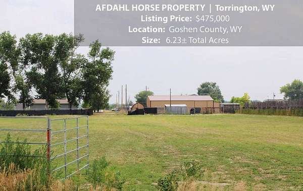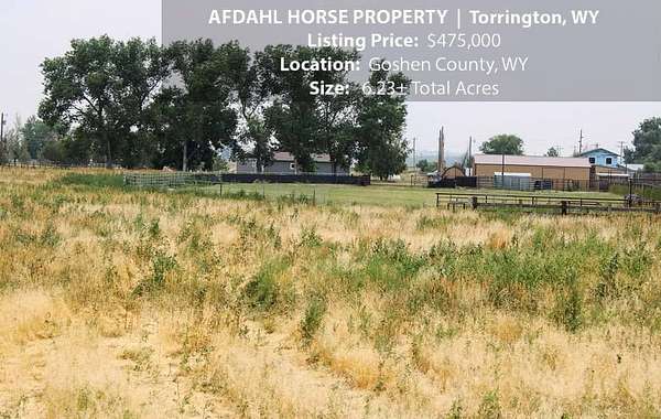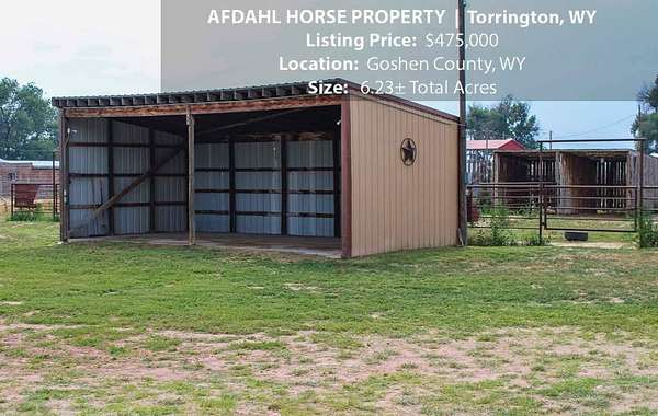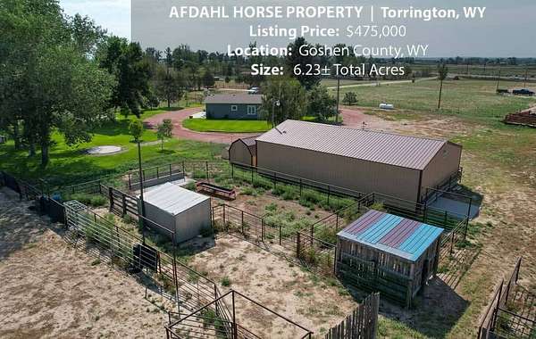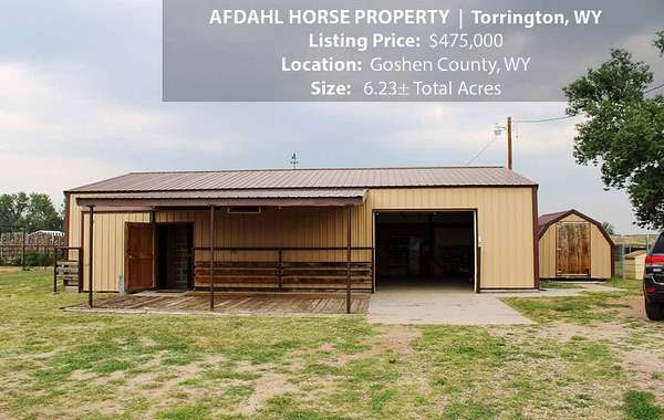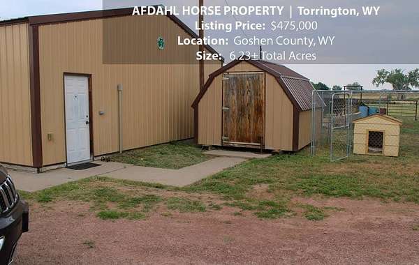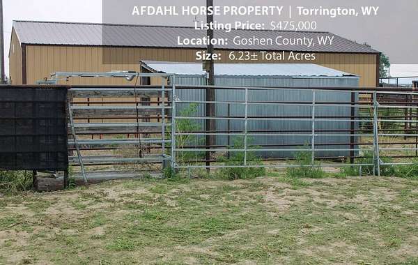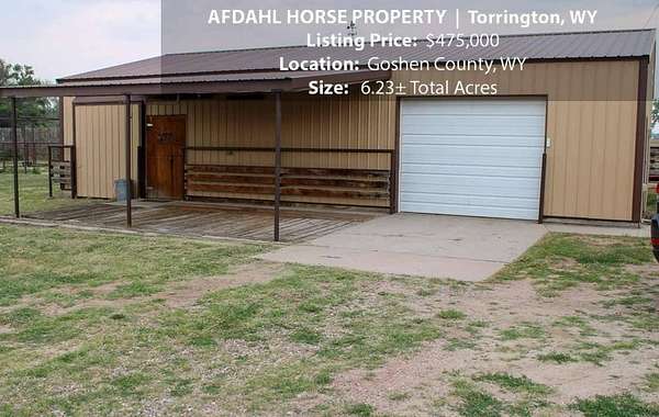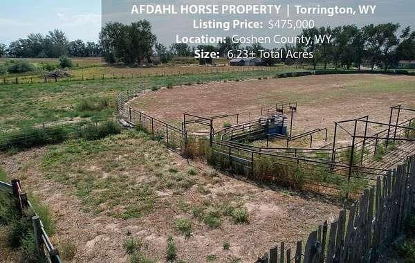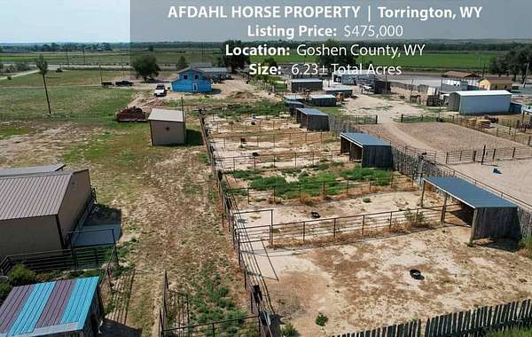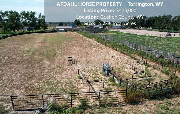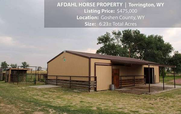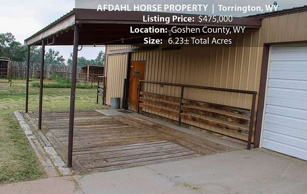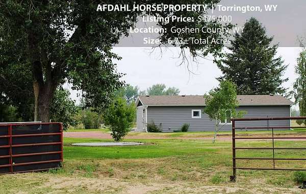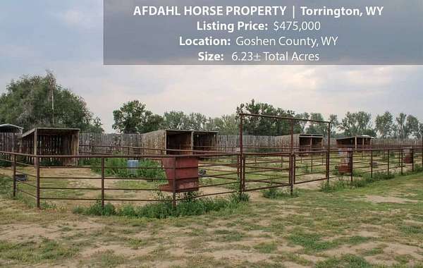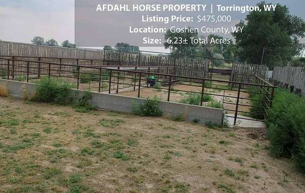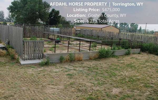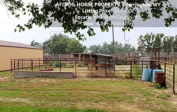 Located just west of Torrington, Wyoming and with great access off of US Highway 26/85 is the Afdahl Horse Property. Situated on 6.23+- acres, this property has everything that the horse lover could need. The 1984 modular home offers 3 bedrooms and 2 full bathrooms and has had numerous recent upgrades including a completely remodeled kitchen and new flooring throughout. The exterior of the home offers an underground sprinkler system and is enhanced by the mature landscaping around the yard. The 1440 sq. ft. shop/barn is divided nicely into shop space that offers ample room to park a vehicle and a tack storage area with a built-in saddle rack and tack hangers. There is also covered tie-out area and an enclosed lean-to for additional storage. This property is ready to bring the horses and roping cattle and is set up with 7 horse runs that are all pipe construction and with loafing sheds and water to all of the runs. Additional pens have been built for livestock including 2 steer pens that have cement feed bunks with a second pen for the calves. A 130X300 roping arena, 450 sq. ft. of covered hay storage, and fenced grazing acreage with water rights round out the improvements.