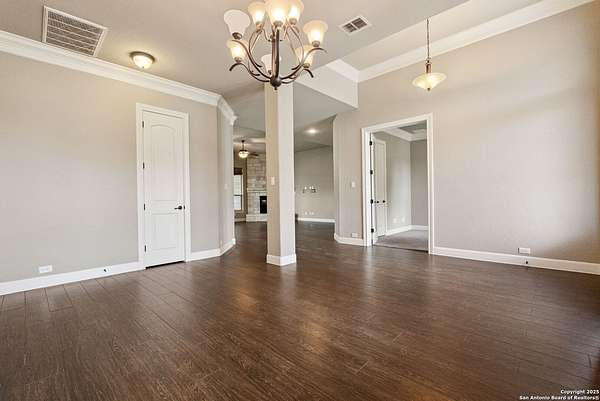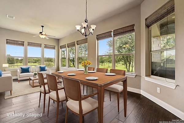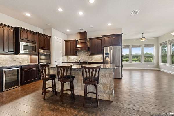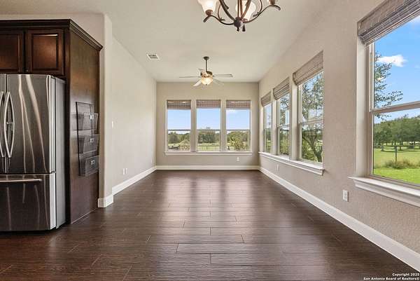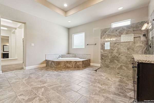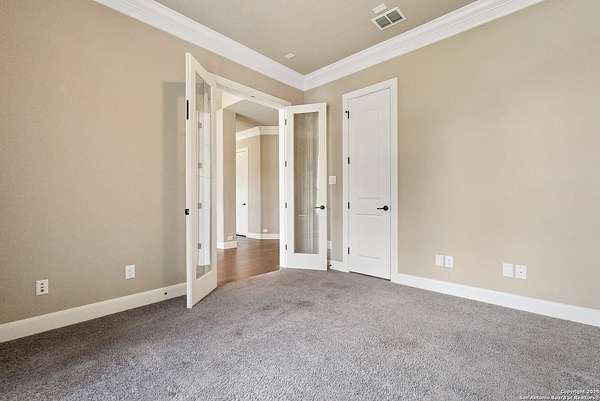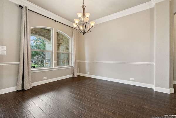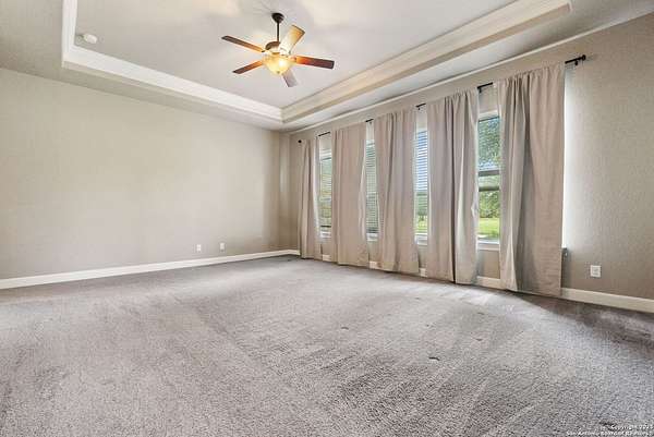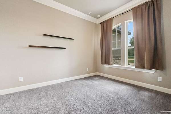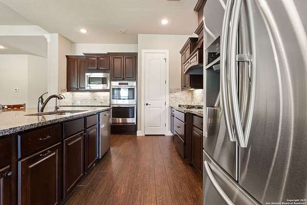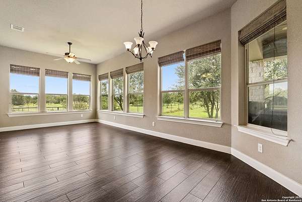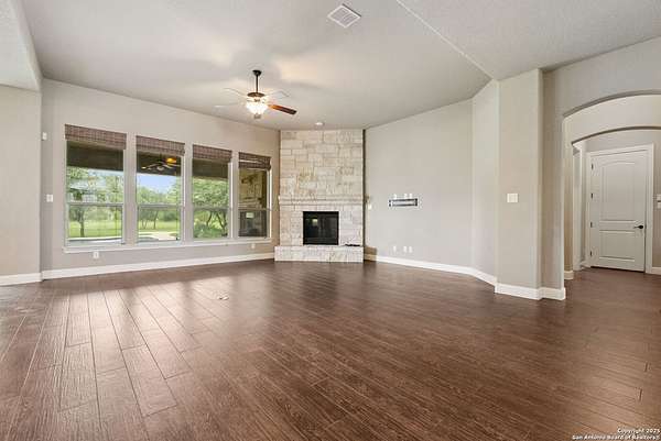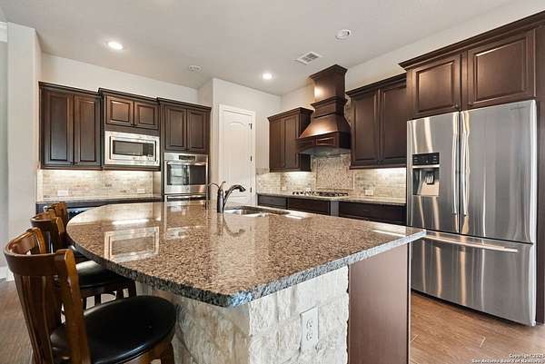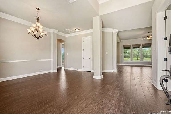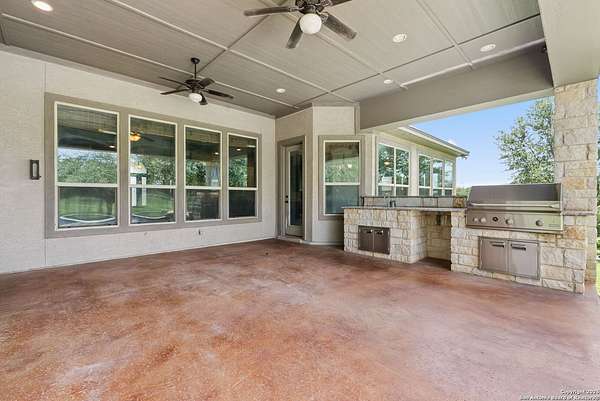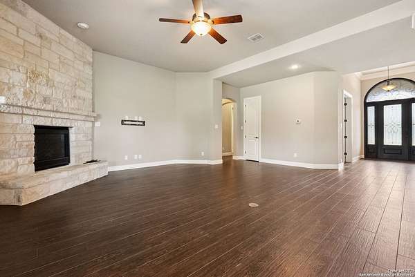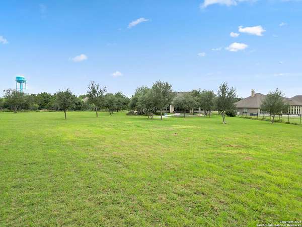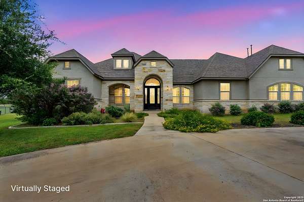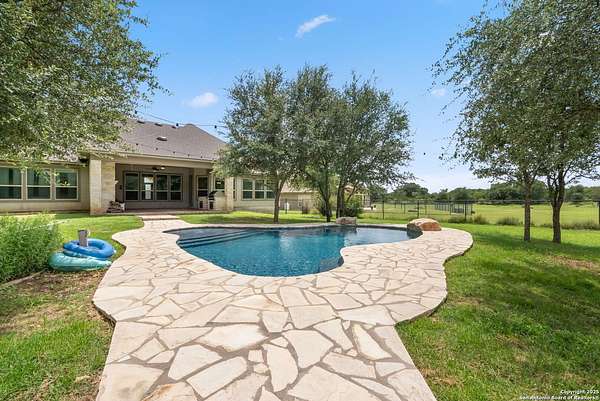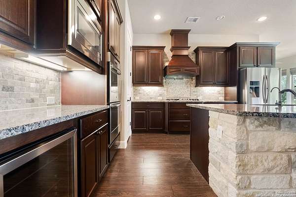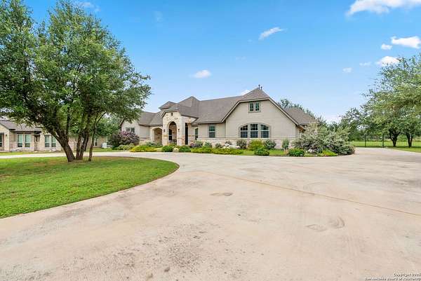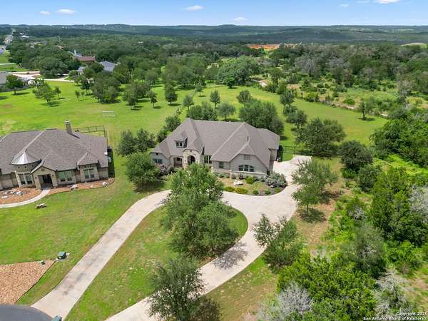Welcome to your private Texas retreat! This beautifully designed 4-bedroom, 4-bathroom custom home sits at the end of a quiet cul-de-sac on a gated 1.7-acre lot, offering privacy, luxury, and space to entertain both inside and out. A grand circular driveway leads you to the stone and stucco exterior, surrounded by mature trees and well-kept landscaping. Inside, the home features tall ceilings, crown molding, and rich wood-look tile floors throughout the main living areas. The open-concept layout includes a spacious living room with a stone fireplace and large windows overlooking the backyard. The gourmet kitchen is a dream for any chef, complete with granite countertops, dark custom cabinetry, stainless steel appliances, a gas cooktop, and a large island perfect for gatherings. Just off the kitchen, the sun-drenched breakfast area offers peaceful views of the backyard, while the formal dining room adds a touch of elegance for entertaining guests. The primary suite is a true escape, featuring a large bedroom with soft natural light and a spa-inspired bathroom with dual vanities, a soaking tub, a walk-in shower, and plenty of storage. Each of the additional bedrooms is generously sized, and the layout includes a private study, ideal for working from home. Step outside to enjoy your own backyard oasis. The covered patio features a full outdoor kitchen and fireplace, perfect for entertaining year-round. Cool off in the sparkling in-ground pool or relax under the trees while enjoying the peaceful greenbelt view behind the home. This property blends upscale finishes, thoughtful design, and outdoor living in one incredible package. It's not just a home-it's a lifestyle!
