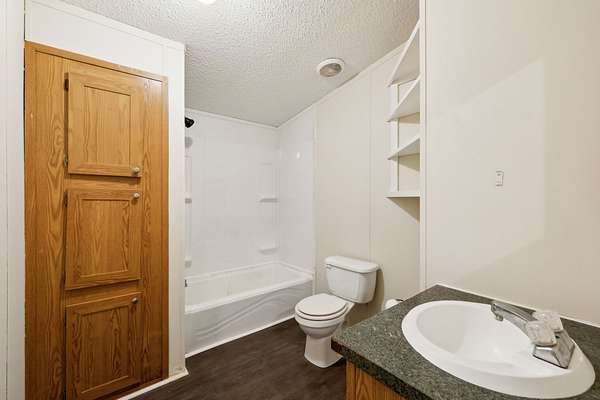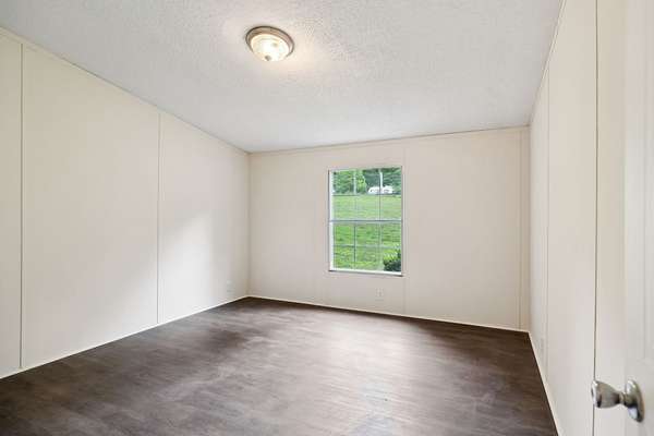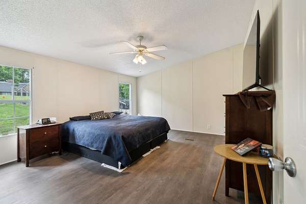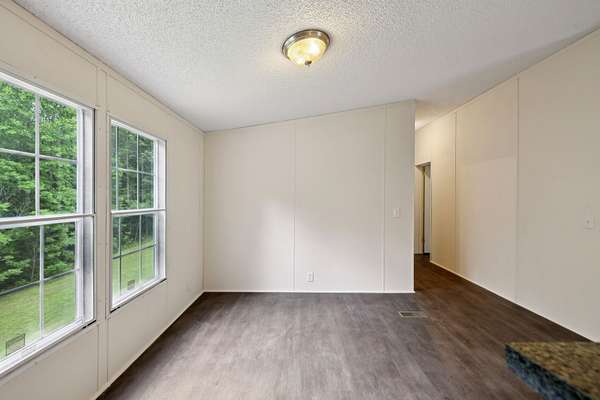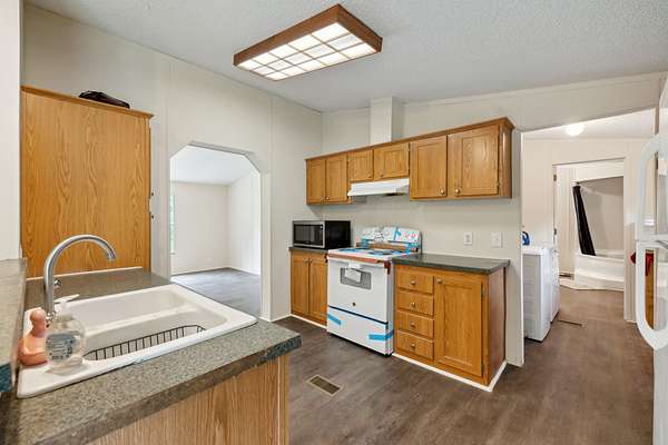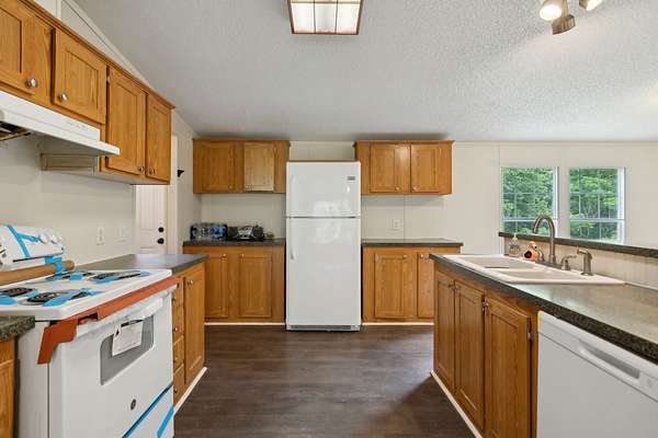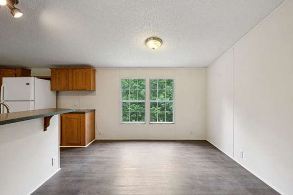 Easy Care! Manufactured home on a permanent foundation~LVP flooring throughout for easy care~ perfectly sized fenced in front yard for your loved ones both two and four legged~ all kitchen appliances remain (stove-new, dishwasher 1 year old, microwave-new), open kitchen/living room concept with bar for extra seating~large master suite and full bath with combo tub/shower only this tub is an oversized soaking tub~ detached garage could also be a good workshop~private back yard which is currently treed so you could clear out more space for a yard if you wanted~plenty of extra room for parking vehicles, boat or ATV