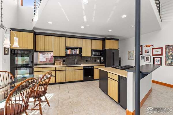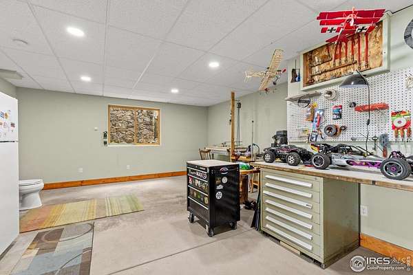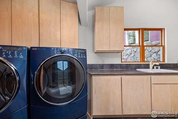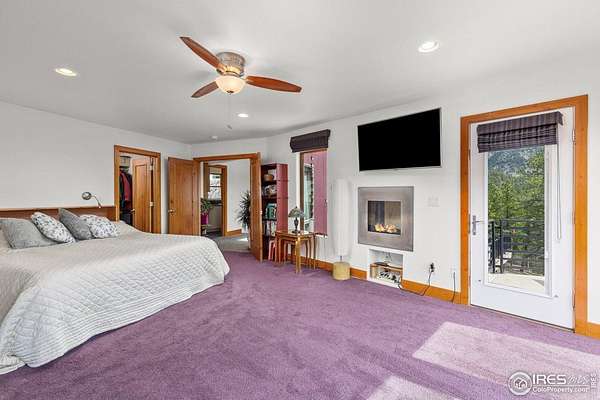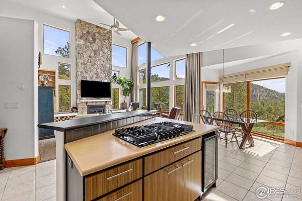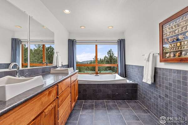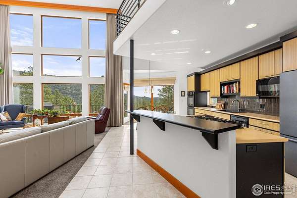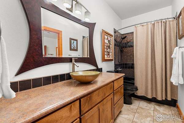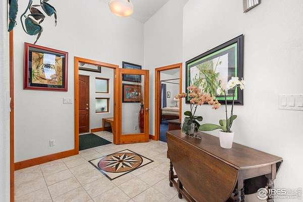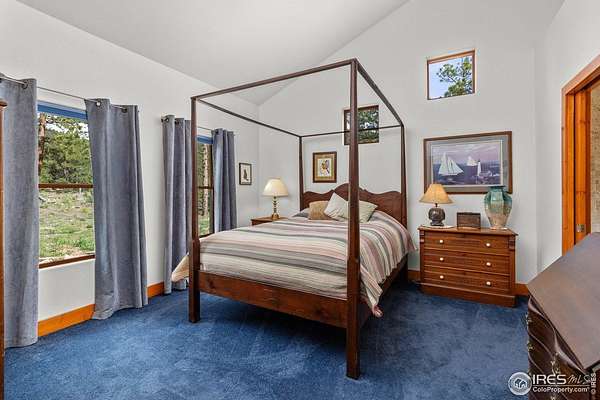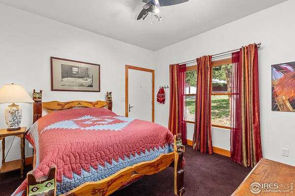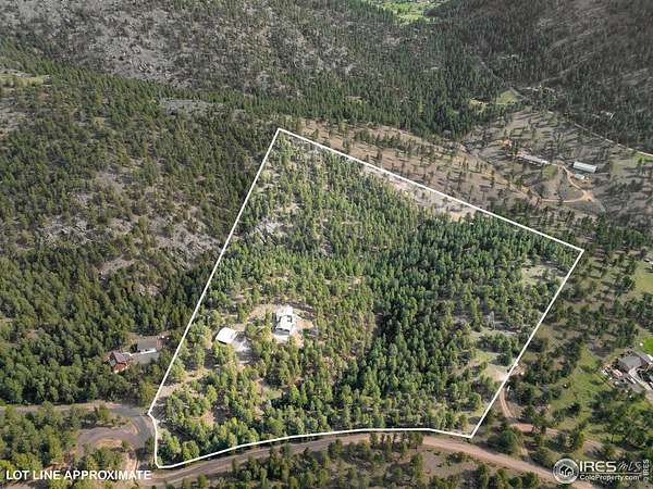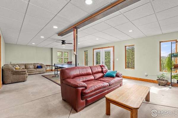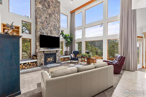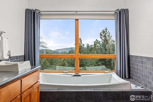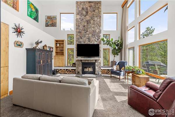 Experience mountain living in this custom-built contemporary home nestled on 35 private acres in the Saddle Notch Ranch area just west of the City of Loveland. Designed for comfort, energy efficiency, and connection to nature, this property offers unmatched views through soaring floor-to-ceiling windows in the expansive great room, showcasing the stunning natural surroundings. Thoughtfully constructed with high insulation values, passive solar design, in-floor radiant heating with 12 zones, and a whole-house fan, the home stays comfortable year-round. The open-concept layout includes a chef's kitchen with Tigerwood custom cabinetry, a five-burner gas cooktop, double ovens, large island with seating, walk-in pantry, and deck access for indoor-outdoor living. The main floor also features a guest suite with private entrance and jetted tub, and a unique mudroom off the attached four-car garage with ample storage. Upstairs, the loft-level home office overlooks the great room and sweeping landscape. The primary suite is a peaceful retreat with a gas fireplace, large walk-in closet, luxurious bath with dual showerheads, body sprays, and an oversized jetted tub with a view. The laundry room, also located off the primary suite, offers exceptional functionality with custom cabinetry and organization features. The large partially finished/unfinished walk-out basement-with 220V power has a separate entrance and is currently being used by the Sellers as a recreation room and hobby room/shop. Additional property highlights include CAT 5E ethernet wiring, custom window coverings, decorative ceiling fans, and a 1,000-gallon indoor cistern system. The fenced outdoor area is pet-friendly with room to expand, and the oversized driveway leads to the nearly new detached 4 car garage with 1,140 square feet of additional space! Enjoy privacy, sustainability, and panoramic views in a truly special setting. Shown by appointment only. Located on a private road-no drive-bys, please.