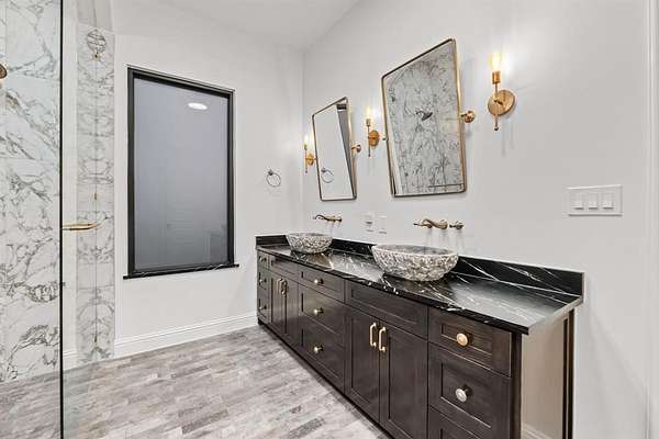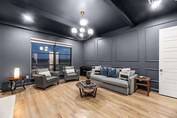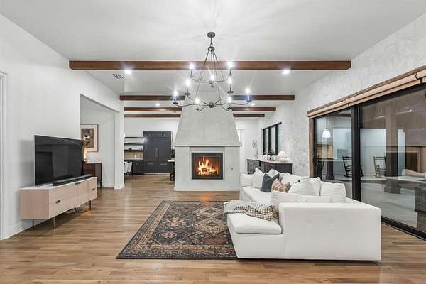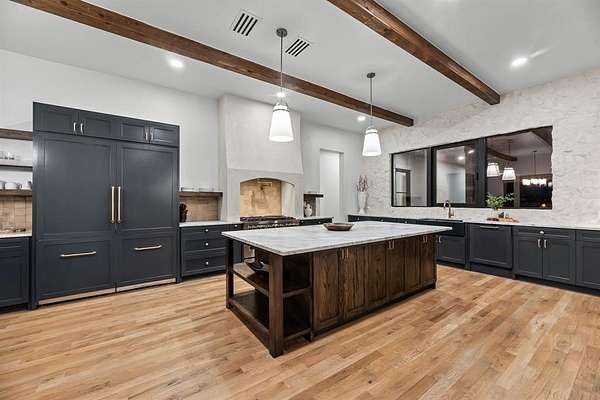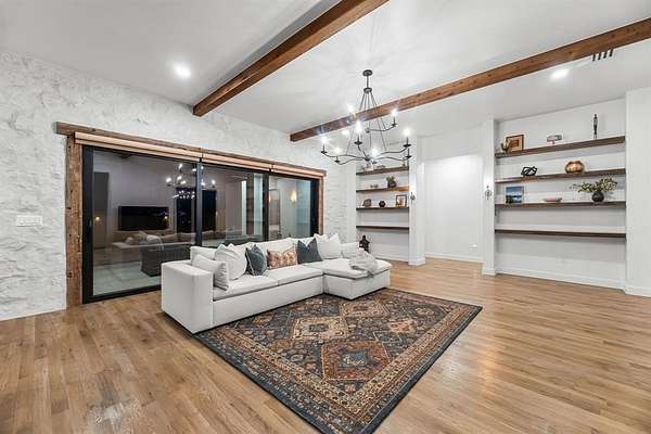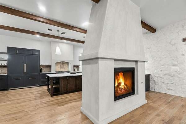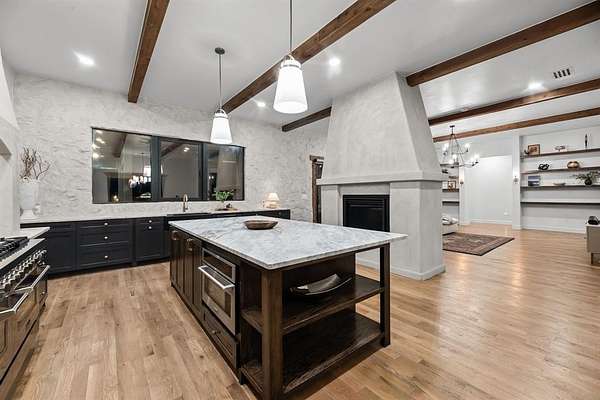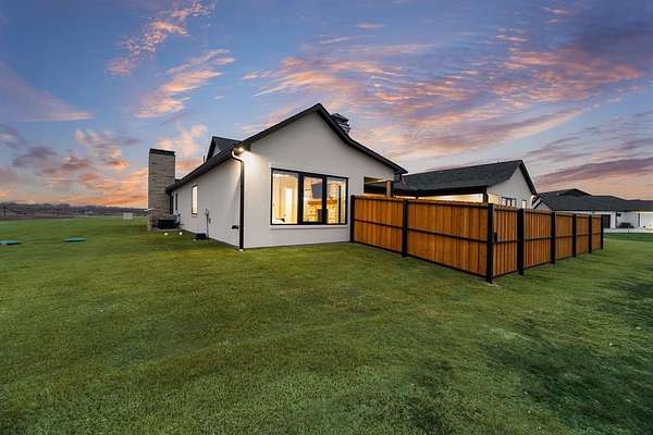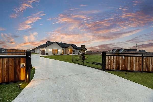 Welcome to an extraordinary, fully custom ranch style estate offering the pinnacle of luxury living in Krum, ideally situated on a quiet cul-de-sac and set on 2+ acres of beautifully landscaped land. This stunning residence features 4 bedrooms, 4.5 bathrooms, and two expansive family rooms designed for both refined everyday living and grand-scale entertaining. The chef's kitchen is a true work of art, showcasing a sleek double panel built in refrigerator and freezer, an oversized walk-in pantry, premium appliances, and exquisite custom finishes throughout. The main living space is anchored by a dramatic two sided, floor to ceiling fireplace, creating an elegant focal point that flows seamlessly between living areas. Custom floating shelves and expansive sliding doors open to a private backyard oasis, perfectly blending indoor and outdoor living. The luxurious primary suite is a serene retreat, complete with its own striking fireplace and spa inspired ambiance. Additional highlights include a underground storm shelter for peace of mind, a whole home water softener, and a fully fenced property secured by a custom motorized gate, offering privacy, convenience, and exclusivity. Every detail of this home is completely custom, reflecting superior craftsmanship, timeless design, and an unparalleled lifestyle in a peaceful acreage setting.