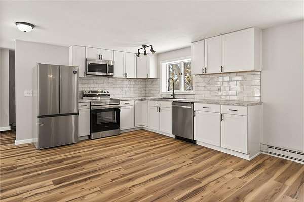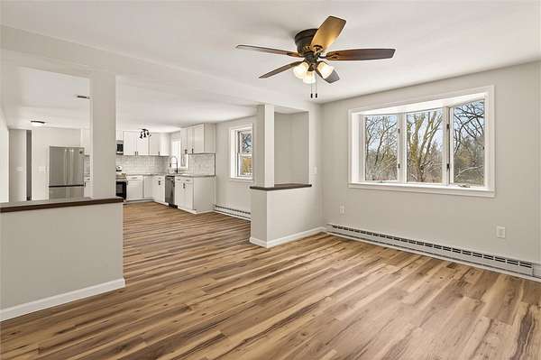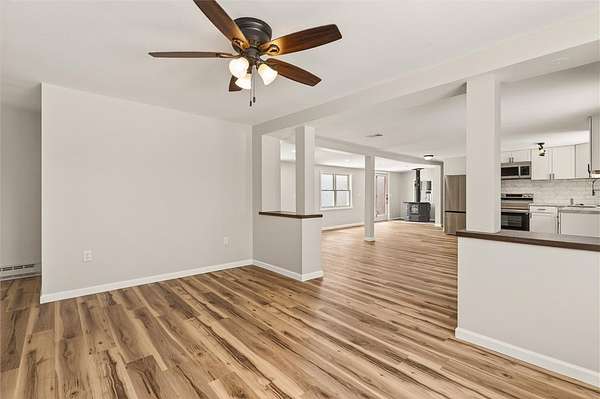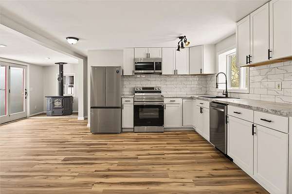 Welcome to this beautifully fully rennovated home, situated on a spacious 1.6 acre lot offering both privacy and room to enjoy the outdoors! Set back off the road, there is an attached two car garage and large shop/barn space at the end of the expansive driveway, ideal for hobbies or workshop space. Inside the home features a modern open floor plan, and bright white kitchen with all new appliances and cabinetry, perfect for cooking and entertaining. Downstairs you will find a large first floor primary bedroom and full bathroom with walk in shower that is very accessible. There is also a deep laundry room on the first floor with ample storage. The metal roof is 4 years old and septic just pumped! If you're looking for move in ready, and workshop options with ample parking, this home is a must see!
