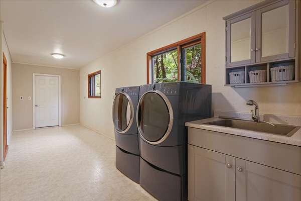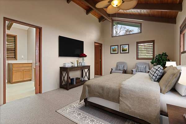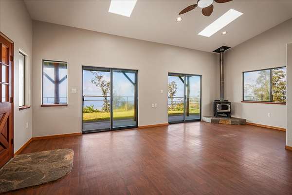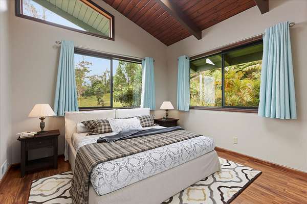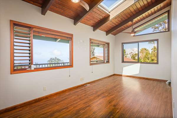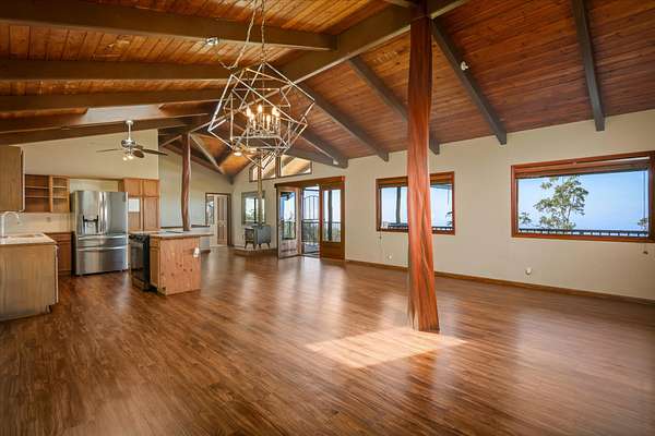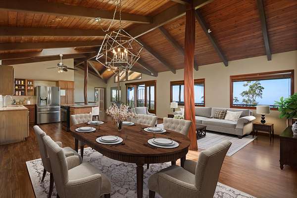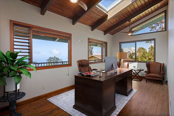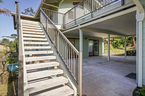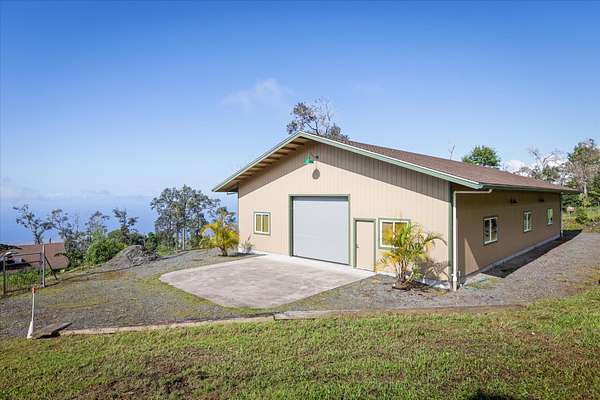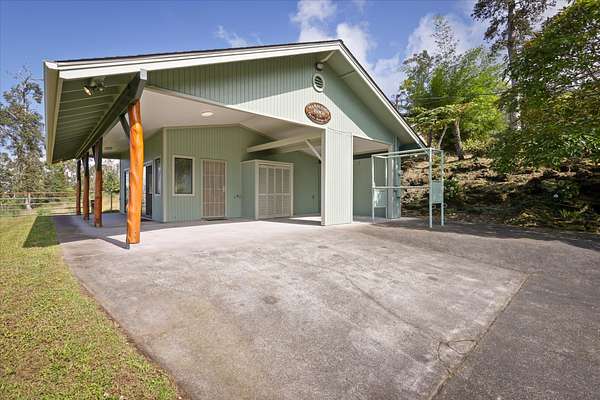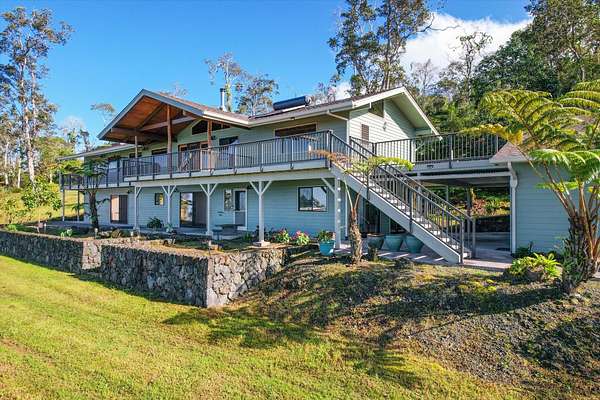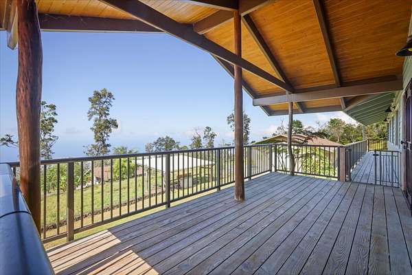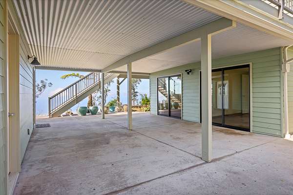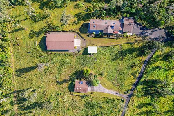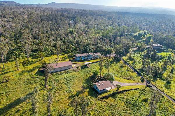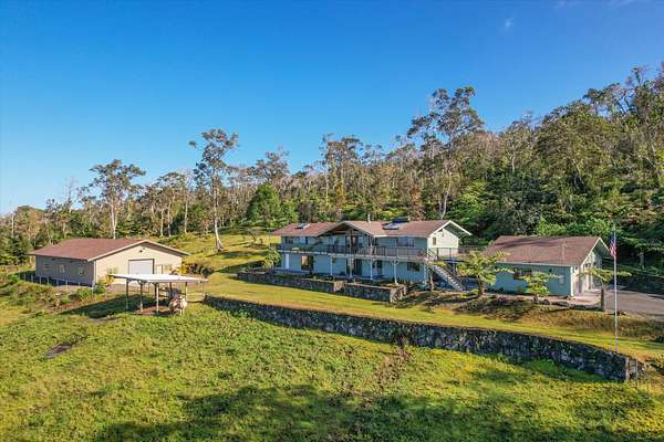 Exceptional country home in desirable Kaloko Mauka with sweeping ocean and coastline views. Spanning 13.5 acres, this compound blends open pastureland with native forest-an ideal setting for a homestead, agricultural ventures, or equestrian pursuits. Adjacent to Palani Ranch and opposite a noted coffee farm and roastery, the secluded estate is nestled in the cloud forest at approx. 3250' median elevation yet is located less than 10 miles from downtown Kona. The impressive residence is positioned on a gentle slope framed by native trees, tall hapuu ferns, and hand-stacked lava rock terraces. Its classic mauka architecture features open-beam ceilings, wide roof overhangs, and extensive wraparound lanai. The main entrance opens into a small foyer with halls on either side of a central staircase. Off the hallways are two bedrooms, bath and utility room. Two spacious workshops adjoin the utility room, both with three entryways and wide-ranging views. The second level, accessible by indoor or outdoor stairs, has an open layout with big windows framing ocean and forest. The great room, with wood-burning stove and French doors, naturally separates the spacious primary suite from the 2020 addition of guest bedroom, bath, and light-filled office overlooking the inspiring vista. Property highlights: *3 bay 864 sq ft garage with attic access from sundeck, and two utility closets below (2020) *3040 sq ft storage barn with roll-up doors and 10 windows (2022) *1-bed/1-bath 576 sq ft cottage with carport, covered lanai, laundry closet and horse stock *Open-air horse shelter (2020) *6+ acres of solar powered, fenced pastureland *A level, fenced one acre equestrian area bordered by koa trees *3.75 acres of dedicated Native Forest *Grassy farm track to access mauka areas *Main home whole-house dehumidifier This estate is offered as Unit #3 within a 3 unit CPR.