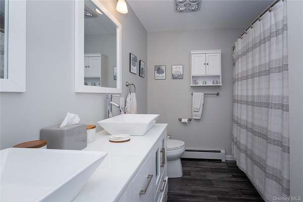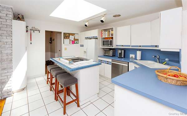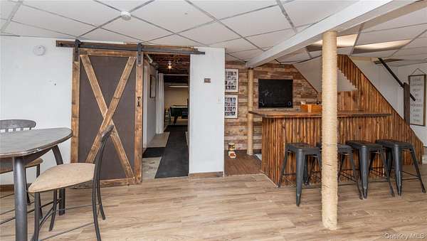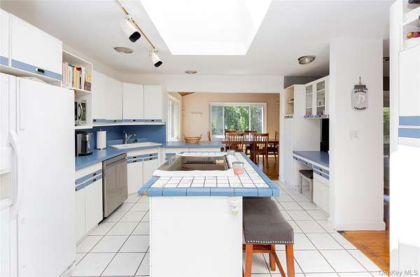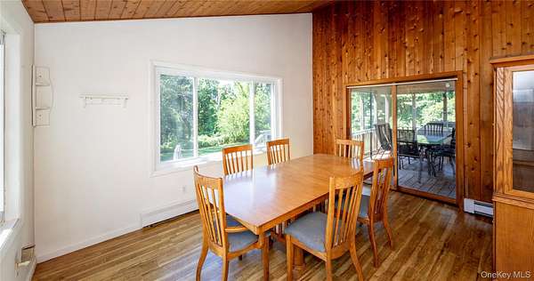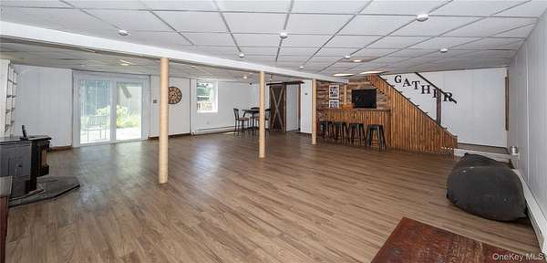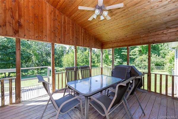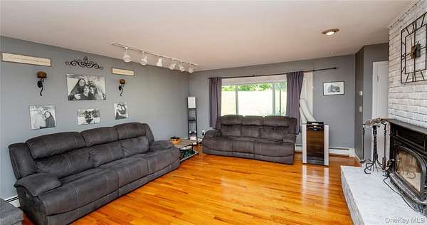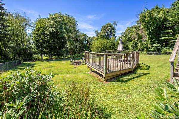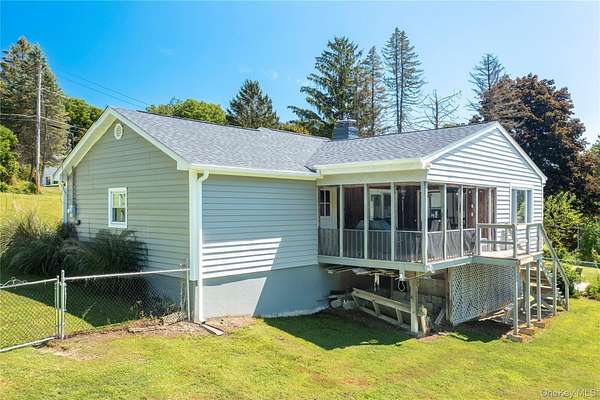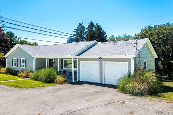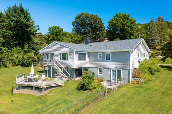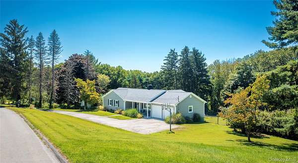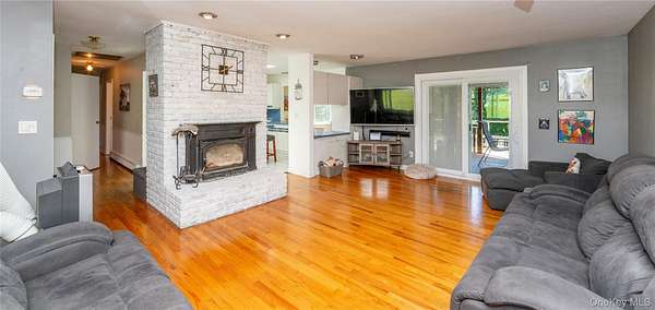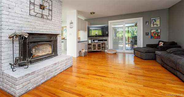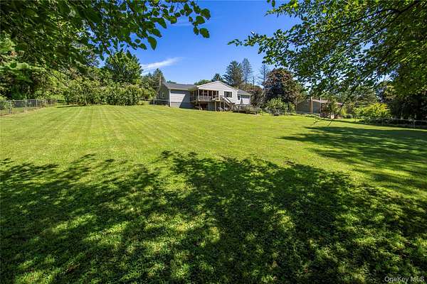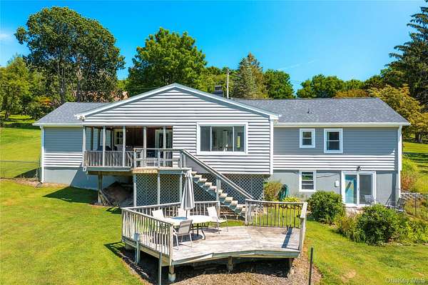 Set on 1.96 acres, this 3-bedroom, 2.5-bath ranch offers one-level living at its finest. A cozy front porch greets you and leads into a bright, open entry connecting both the kitchen and the living room. The spacious living room features a centerpiece fireplace with a wood-burning stove insert, hardwood floors, sliding glass doors to the covered back deck, and a seamless flow into the kitchen. The kitchen is filled with natural light from a large skylight above the center island, offering ample storage and functionality. Just off the kitchen is a stunning dining room with soaring vaulted ceilings, expansive windows, and sliding glass doors opening to the back deck--perfect for entertaining. Down the hall, you'll find a beautifully updated full bath with a double vanity, full tub, and linen closet, along with two bedrooms offering hardwood floors and generous closet space. The primary suite provides double sliding-door closets, hardwood flooring, and a private full bath with a walk-in shower. The finished basement extends the living space with a large entertaining area, sliding glass doors to the backyard, a convenient half bath, and plenty of storage. Don't miss your chance to call this inviting home your own!