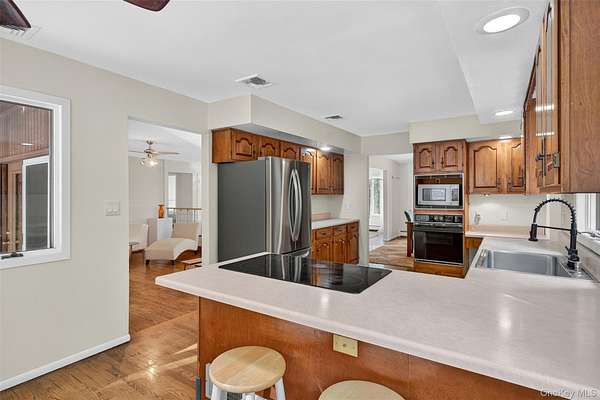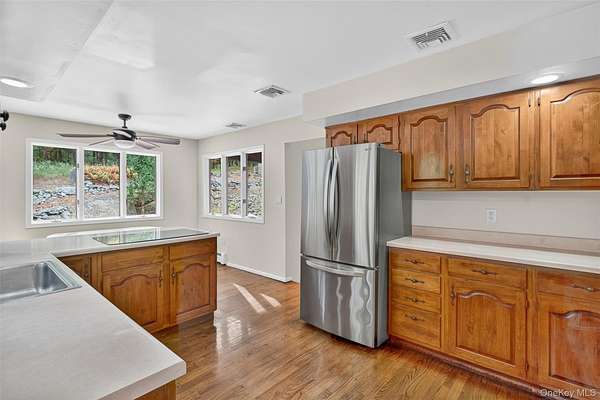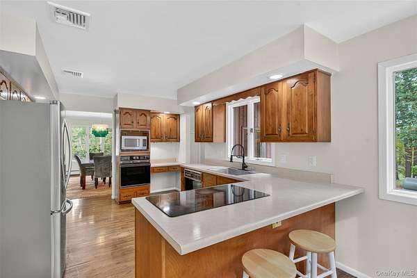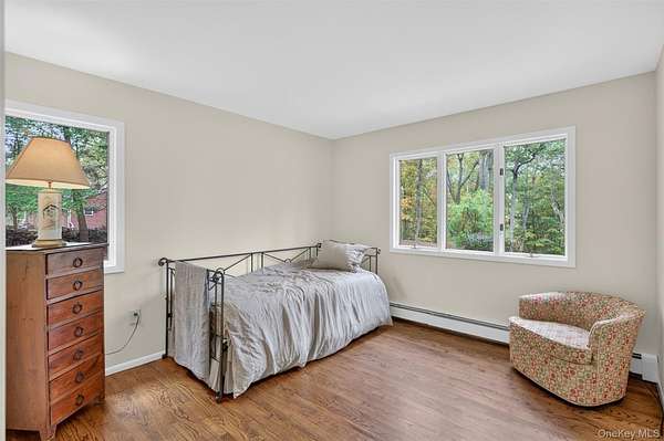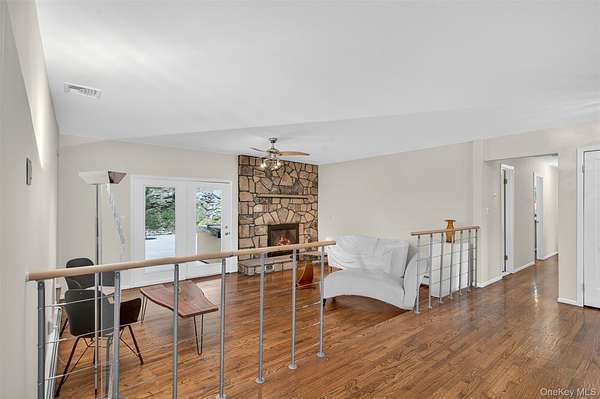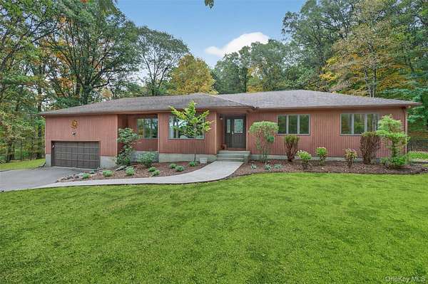 As you drive up to this enchanting 3.2 acre parcel you are met with mature trees and professionally landscaped garden beds. You will be enamored by the calming waterfall, majestic koi pond, and oversized patio in the tranquil backyard that is ideal for relaxation, or entertaining. A freshly seeded, fenced-in, level lot also provides ample space for fun in the backyard. This idyllic ranch is tucked up off the road giving you privacy and a true sense of serenity. As you enter the freshly painted interior you will notice gleaming hardwood floors and a stone fireplace that will quickly become the centerpiece of your day to day. An oversized picture frame window adorns the sitting room giving you a sense of indoor-outdoor living. The spacious formal dining room leads you into the light-filled kitchen with a wolf cooktop peninsula, new fridge, and eat-in-dining area. Just off the kitchen is a main-level laundry/mud room that can be accessed through the 2 car garage. Three bedrooms and two full bathrooms complete the main level, including a primary ensuite. This ranch home also features central air, a whole house generator, 3 year old furnace and boiler-mate (energy efficient), 200 AMP electric and a full sized basement with ample storage and workshop. Set in bucolic Warwick just minutes from the Village of Warwick and Village of Florida, wineries, breweries, farm stands, hiking trails and so much more. Make this Warwick gem your home sweet home. Only 1 hour from NYC.