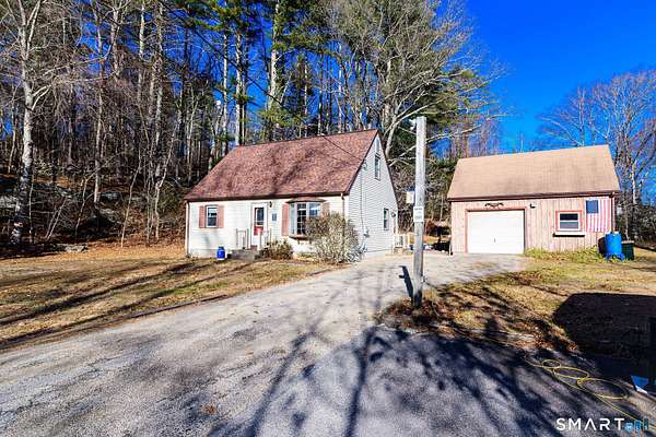 Lovely one owner, 4 bedroom cape in immaculate, move in condition! This home is set on a beautiful, private 5.3 acre lot on a quiet non-through street. The first floor has a sunny eat-in kitchen, with appliances included, a living room, two bedrooms and a full bath. Upstairs are two spacious bedrooms with closets, and a storage nook in the hallway. The full basement has a washer and dryer which are included. There is a large, detached garage with workbenches, and lots of storage on the upper level. Recent upgrades include a new back patio overlooking the private back yard. The well pump was replaced in 2012, and the septic system was updated in 2025 with new distribution boxes and a new 1500 gallon septic tank. This large, private property is perfect for gardening and outdoor enjoyment, and includes a greenhouse and fruit trees. This home has been lovingly cared for, and is ready for new owners to make their memories here. Schedule a showing, and be in your new home this spring!