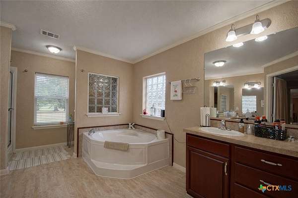 - All Bedrooms Down, Ceiling Fans, Crown Molding, Dining Area, Double Vanity, Entrance Foyer, Furnished, Garden Tub Roman Tub, Laminate Counters, Main Level Primary, Primary Downstairs, Separate Formal Dining Room, Separate Shower, Tub Shower, Vanity, Walk In Closets
