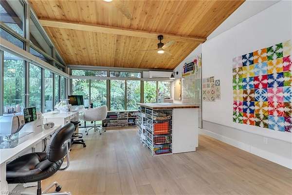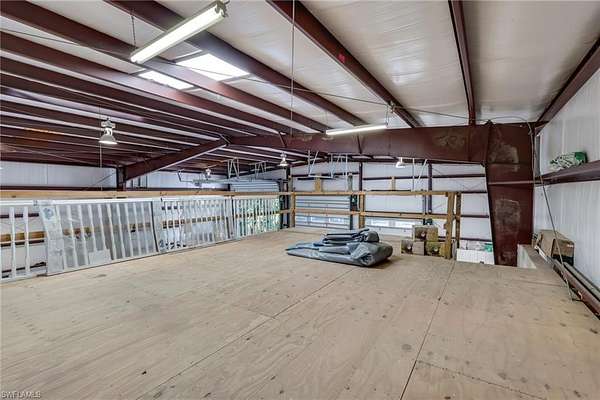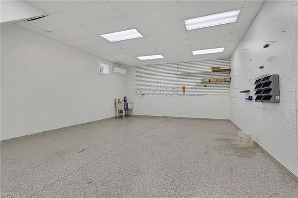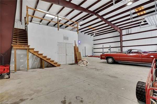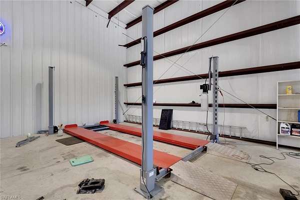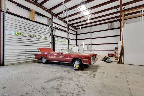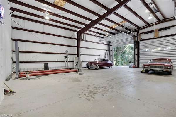 Welcome to a rare Golden Gate Estates offering featuring luxury living, resort-style outdoor amenities, and an extraordinary 4,800sf climate-controlled workshop/garage, all situated on 2.5 beautifully maintained acres with 100% uplands. The 2,089sf main residence has undergone over $250,000 in high-end upgrades within the past two years, blending modern design with long-term durability. Features include impact windows, top-of-the-line Bosch appliances, high-gloss acrylic cabinetry, quartz countertops, porcelain tile throughout, a butler's pantry, and automated smart window blinds. An all-window sunroom overlooks the resort-style pool and lush botanical grounds, creating seamless indoor-outdoor living and exceptional natural light throughout. The outdoor space is designed for both relaxation and entertaining. The oversized saltwater pool showcases multiple waterfall features, a dramatic rock waterfall, spa, gas heater, and built-in propane firepit with a brand-new propane tank. Fully irrigated grounds resemble a private botanical garden and include a koi pond, water fountain, gazebo, mature fruit trees, and storage sheds. The property is fully fenced with a power-gated entrance and an asphalt driveway extending to the rear with circular access for effortless maneuverability. RV hookups are already in place, and the garage/workshop structure can accommodate two 48-foot RVs. The 4,800sf red iron steel garage/workshop is the defining feature of this estate. Approximately 3,600sf is dedicated garage space capable of housing a substantial vehicle collection, oversized equipment, boats, or recreational vehicles. The insulated structure includes its own septic system, 200-amp electrical panel, water service, three garage mini-split systems, and central air systems serving the finished areas. The lower level offers approximately 1,200sf of finished space with a partial kitchen and full bath, while the upper level provides approximately 1,200sf of office space. A dedicated tool room with overhead storage and a large carport add further flexibility. Opportunities to acquire a fully improved acreage property with this level of recent renovation, climate-controlled garage space, and infrastructure are rare in Naples. With no HOA restrictions and flexible zoning, this Golden Gate Estates property offers exceptional versatility, privacy, and long-term value.