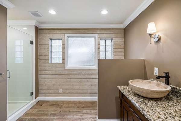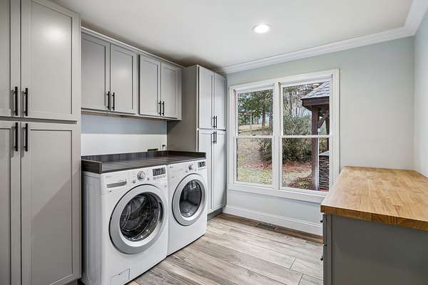 The home is perked for three bedrooms and provides flexible living space to suit a variety of needs. One of the bedrooms is currently being used as a hobby room and laundry area, though it can easily function as a traditional third bedroom. Laundry hookups are also available near the side entry, tucked neatly behind a wood plank wall, allowing the laundry to be relocated to its original spot if desired.