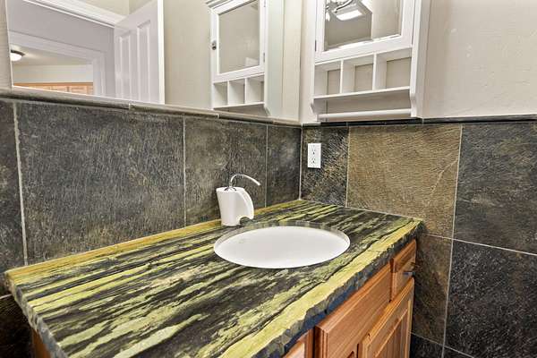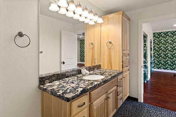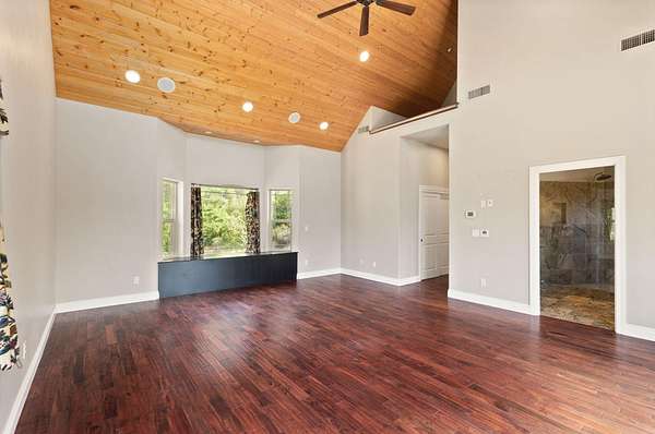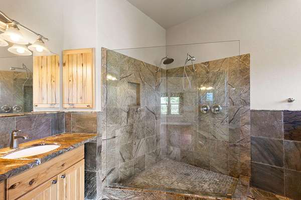 - Bidet, Breakfast Bar, Built-In Features, Ceiling Fan(s), Granite Counters, Kitchen Island, Linen Closet, Open Floorplan, Pantry, Primary Downstairs, Tile Shower, Vaulted Ceiling(s), Walk-In Closet(s)