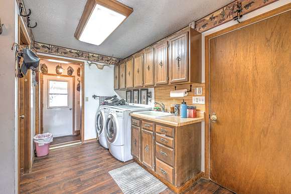 The custom two-story farmhouse was constructed in 1980 and features three bedrooms, two offices (which could serve as additional bedrooms), and three bathrooms. Additional housing includes a modest bunkhouse, perfect for ranch/farm hand housing.