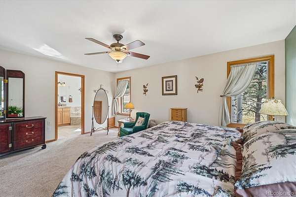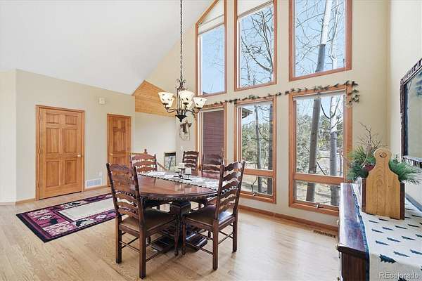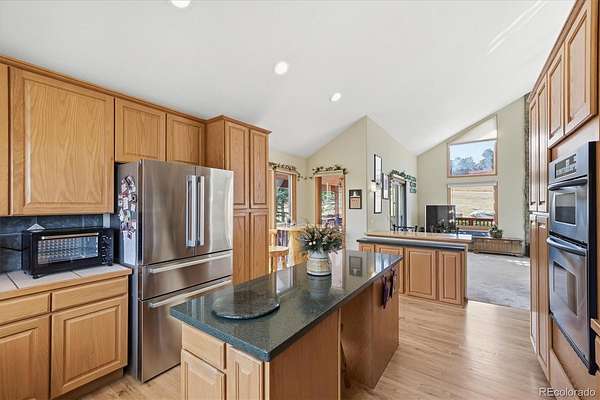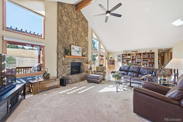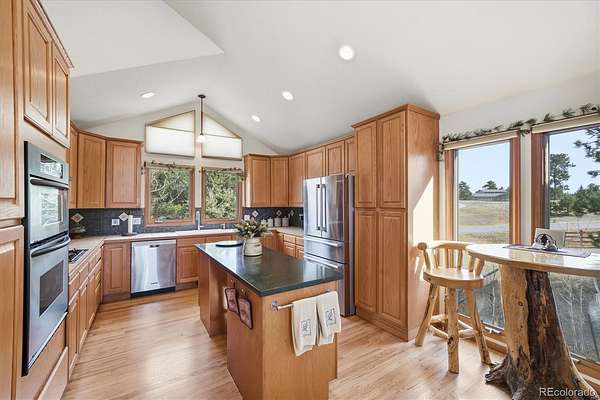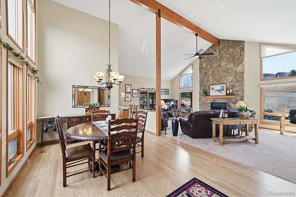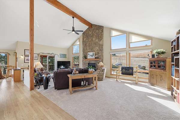 This 4-bedroom, 3-bath home offers true main-level living with a fully finished walk-out lower level and a level, usable 2-acre corner lot. The great room stops people — vaulted ceilings, hardwood floors, walls of windows, and views of the surrounding aspens that change with every season, all anchored by a striking moss-rock fireplace. The kitchen includes a granite island, stainless appliances, and wildlife views from the sink. Three bedrooms and two updated full baths on the main floor, including a primary suite with soaking tub and walk-in closet.