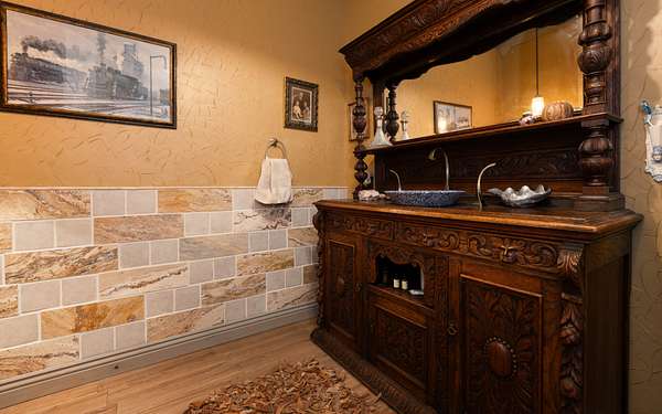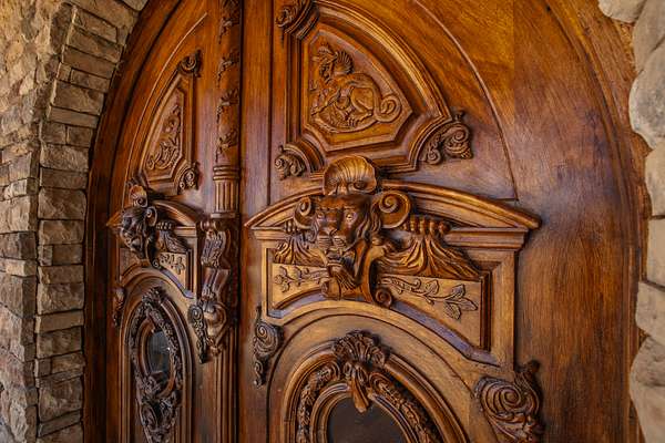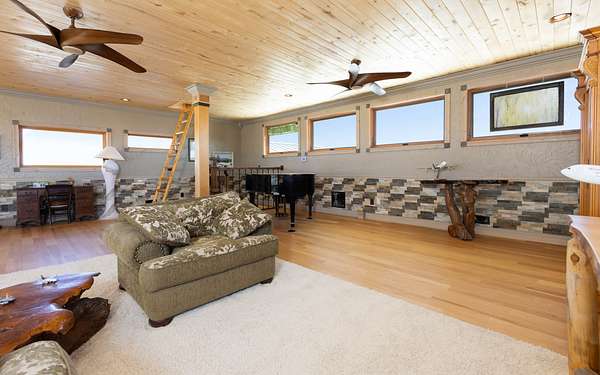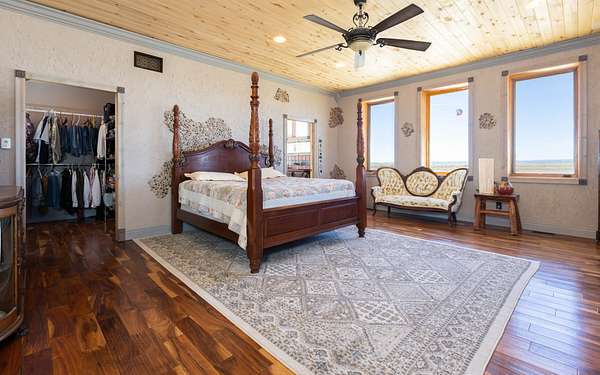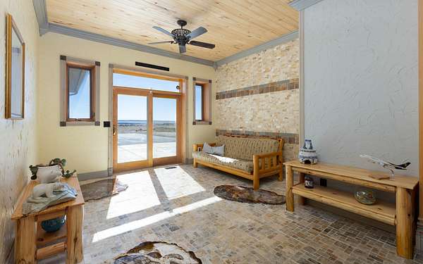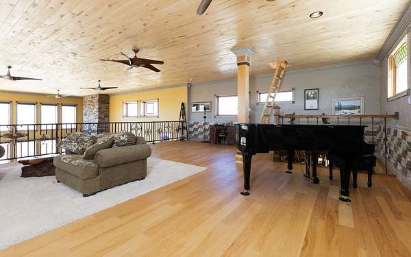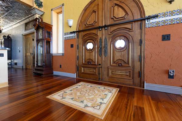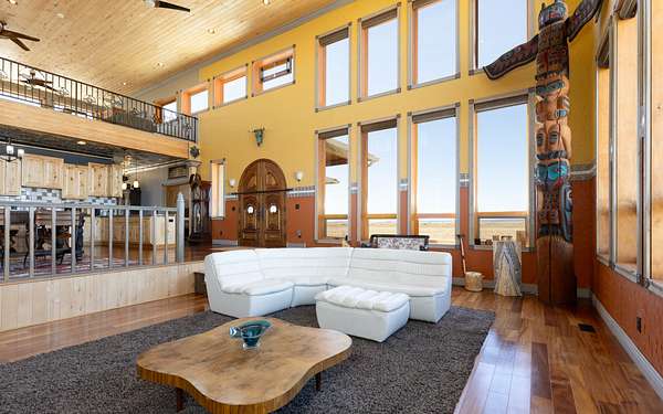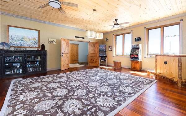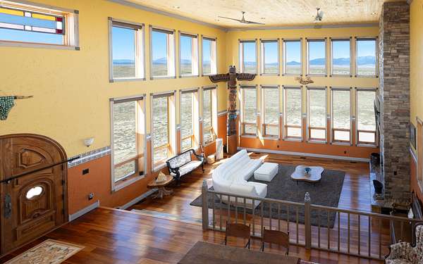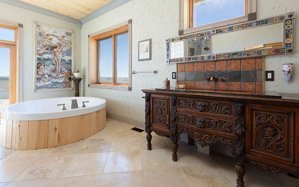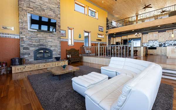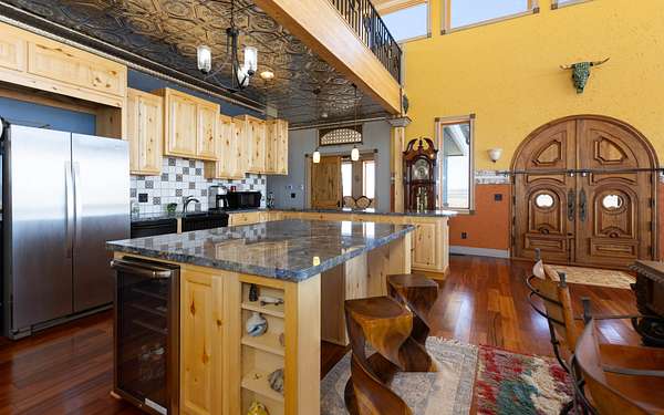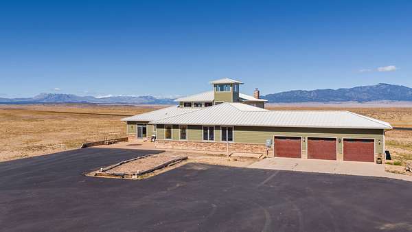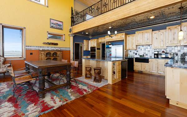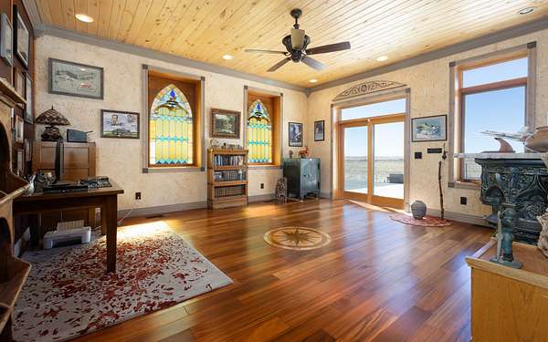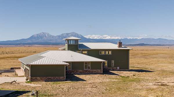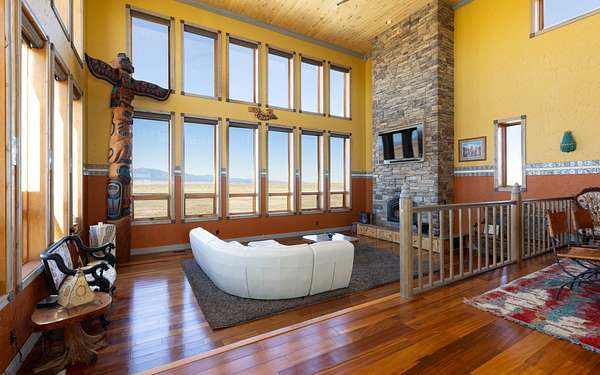 Boasting mountain views that extend from the Spanish Peaks in the south all the way to Pikes Peak in the north, the custom home is a functional work of art, featuring 30’ ceilings; abundant natural lighting; acacia, Brazilian koa, maple, and cherry marble floors; a 30’ custom stone fireplace with Mexican tile inlays; river stone accents, custom crown moldings, and handcrafted Israeli mosaics; antique lights and bath furniture; custom artisanal sinks; stained-glass window features; electric window shades; a custom-made, arched double entry door; and Amish-crafted handmade gutters. A 25×30 loft overlooks the living room, and leads to an observation tower.