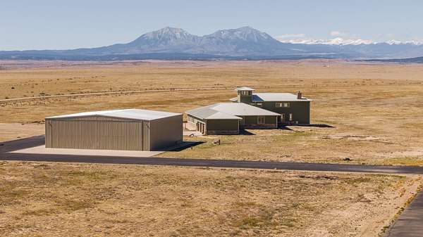 A 30’ paved taxiway leads from the hangar to the runway. 30’ wide by 1 mile in length, the ranch’s FAA-registered runway is the longest private paved runway in Colorado. Southern Colorado weather allows for over 300 VFR flying days per year. Air commuting distances from the ranch: Pueblo, 32 mi; Colorado Springs, 63 mi; Denver, 126 mi; Albuquerque, 188 mi. Trivia: The Flying D runway appears in the video game Microsoft Flight Simulator. The runway, hangar, and home are fenced to keep livestock out.