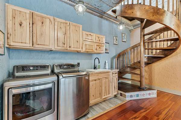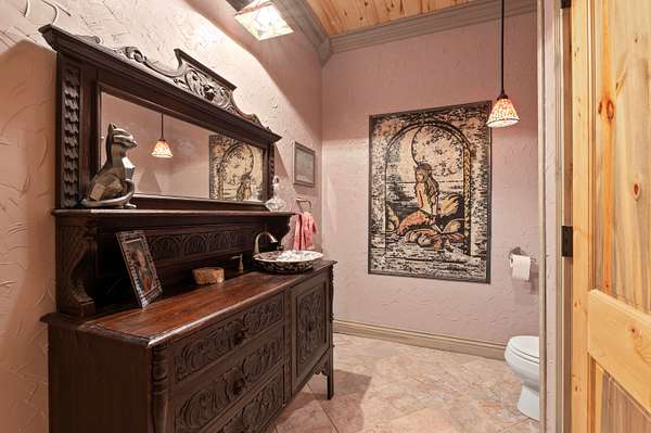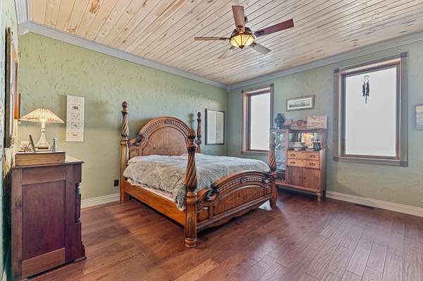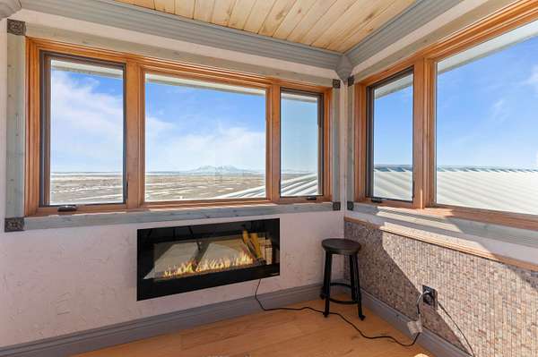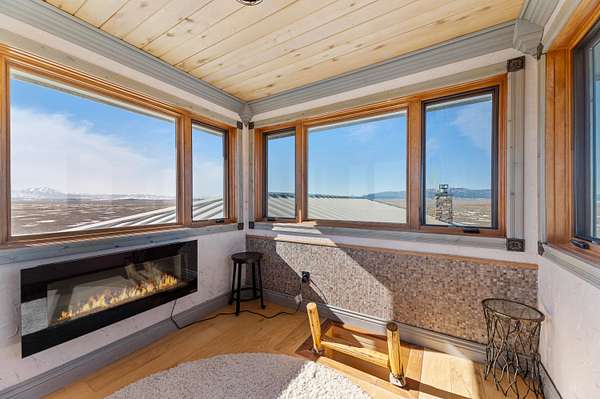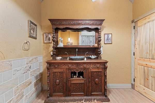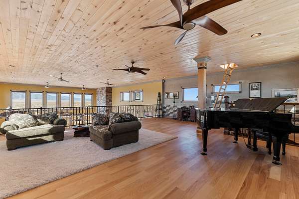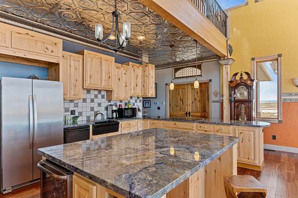 At the center of the ranch sits a 6,545+- square-foot custom residence built with durability and detail in mind. The home features 14-inch insulated concrete form (ICF) construction, providing excellent energy efficiency and strength. The interior showcases premium finishes, including Acacia, Brazilian Koa, Maple, and Cherry Marble Tile flooring. Architectural elements such as river stone wall accents, custom crown molding, and granite and Travertine surfaces create a refined yet warm aesthetic. The great room features a 30-foot ceiling and a custom 30-foot stone fireplace with intricate Mexican tile inlays. Over 20 large windows fill the space with natural light and include electric blinds for convenience. A sunken seating area, spiral staircase to a loft and observation tower, and a secure concrete safe room with a vault door add both comfort and functionality.