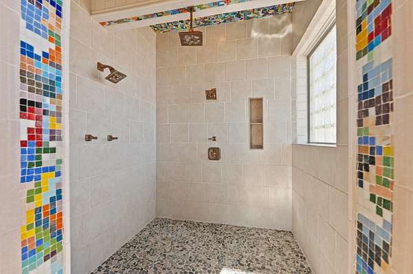 The kitchen is designed for both beauty and performance. Aspen cabinetry pairs with Blue Bahia granite countertops, a Bosch induction cooktop, dual beverage coolers, and a large island for food preparation and gathering. The spacious walk-in pantry supports long-term storage and organization. Each bedroom features an en-suite bathroom and walk-in closet, ensuring privacy and comfort for all occupants. The main suite includes a whirlpool tub, multi-head tile shower, custom coyote glass sink, infrared sauna, and patio access. The home is equipped with geothermal in-floor heating and 120 gallons of hot water capacity, ensuring reliable comfort year-round.