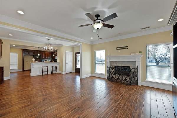 - Chandelier, Decorative Lighting, Eat-In Kitchen, Granite Counters, Natural Woodwork, Open Floorplan, Pantry