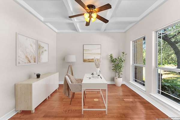 Welcome to Dancing Bear Ranch-where Hill Country views, wide-open skies, and a life of possibility come together. Set on 2 wooded acres, this 4,100+ sq ft home offers 4 spacious bedrooms, a main-level owner's suite, dedicated study, formal dining, game room, and media room. Enjoy the warmth of a stone fireplace, generous natural light, and outdoor patios designed for peaceful evenings or effortless entertaining. Oversized 3 car garage, convenience of sprinkler system, garage door openers, water softener system, gorgeous oak trees. Located just 20 minutes from Hwy 211 and FM 471-one of San Antonio's fastest-growing corridors-this area offers top-rated schools, convenient access to healthcare, shopping, dining, and an easy commute to military bases. A place where Veterans are honored, families thrive, and Texas living feels like home.