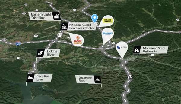 Take exit 137 off I64 to 32 Flemingsburg Road approximately 5.27 miles. You will find the property on the left at the corner of Flemingsburg Rd and Maxey Flats (all behind the houses and trophy shop).