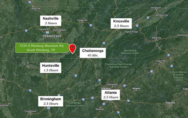Escape to 130+/- ACRES in East Tennessee! Breathtaking BLUFF frontage, mature hardwoods, unique rock formations, and long-range VIEWS create a stunning backdrop for your dream retreat. This South Pittsburg, TN address is perfectly positioned just 40 minutes from Chattanooga and within easy reach of Nashville, Birmingham, and Atlanta. The best of both worlds: peaceful seclusion and convenient access. Dream becomes reality here for one or multiple custom homes, cozy cabin, or as a RECREATIONAL weekend getaway for hiking and hunting. Life ''unplugged'' is within reach: the outdoor potential here is unmatched. Wildlife roams, birds chirp, and views await you! Several CREEKS flow through the property and await your exploration. Don't underestimate the CONVENIENCE FACTOR: Only 10 minutes to South Pittsburg, 15 to Kimball, and 20 to Jasper. Access via South Pittsburg Mountain Rd / Hwy 156 makes travel easy to I-24, restaurants, and big box stores like Lowe's and Walmart. NO STATE INCOME TAX in TN! Build a legacy property in the heart of East Tennessee's mountain country.