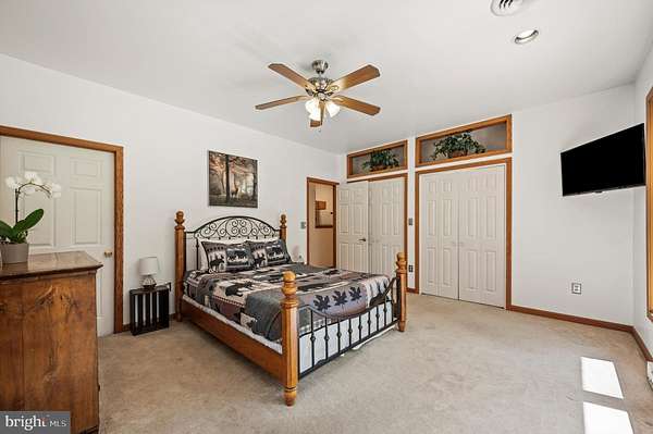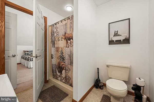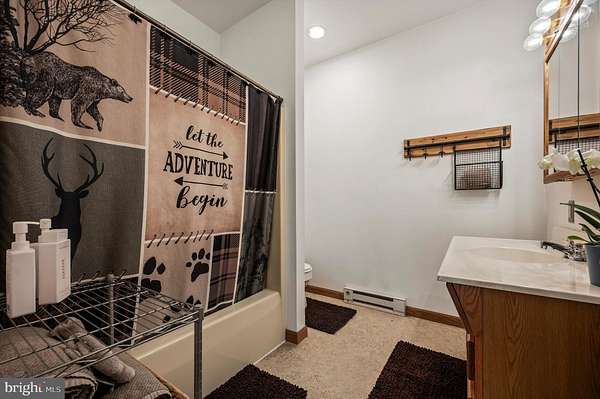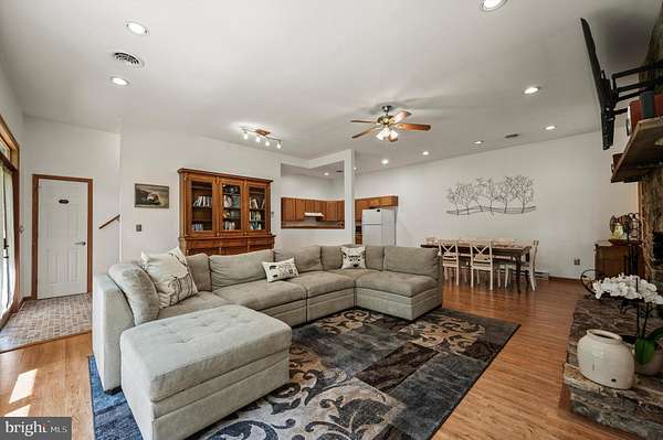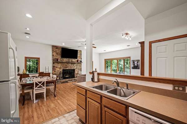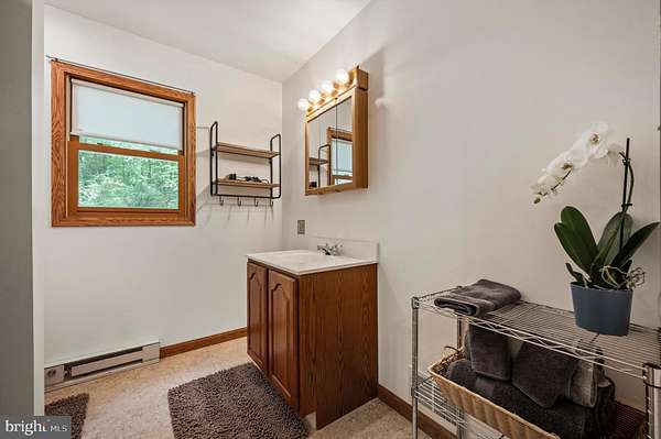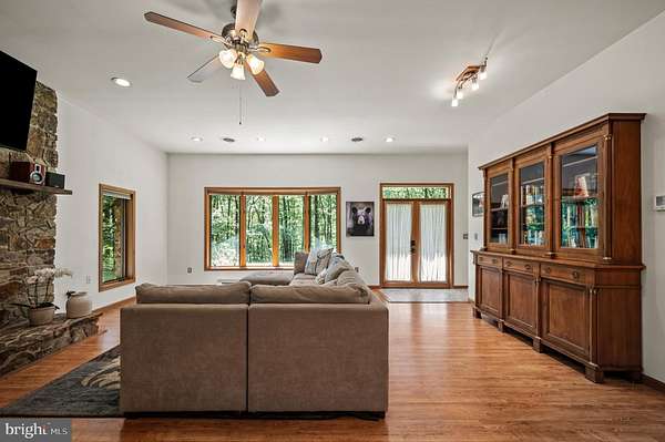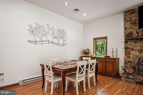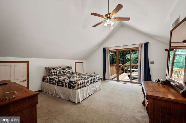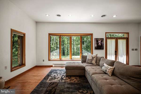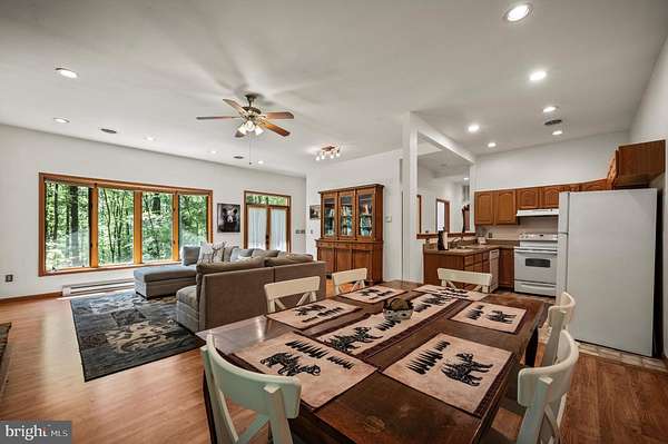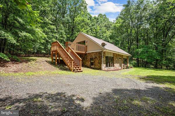 Welcome to this beautifully maintained Berm Home situated on 5 wooded acres, with scenic views that are adjacent to over 22,000 acres of forest located in the Sleepy Creek Wildlife Management Area (WMA). The home features 2 bedrooms, 2 full bathrooms, and 1,725 square feet. Step inside to an inviting open-concept floorplan with 10-foot ceilings and plenty of natural light. The main level features a living room with a cozy wood-burning stone fireplace, a spacious dining area, and a kitchen that features plenty of cabinet and countertop space. The kitchen connects to the dining area and living room, ideal for entertaining and family gatherings. The main level also features a spacious bedroom, a full bathroom, and a laundry room with a new washer and dryer. The upper level features a primary bedroom/suite with a cathedral ceiling, a full bathroom, and a sliding glass door to access the deck. From the primary bedroom, step outside to the deck, a tranquil retreat for your morning coffee and a great space to entertain guests. The property features a front yard with a fire pit and a trail. The rear of the home features woods that back up to Sleepy Creek WMA. Sleepy Creek WMA is situated on two mountain ridges and is covered in mature forest with hunting, fishing, birdwatching and hiking trails. The home can be used as an Airbnb, has Frontier high-speed internet, and comes with furnishings and TV's. Located a short distance from shopping, restaurants, and a hospital in the Town of Berkeley Springs. A must see!