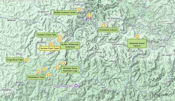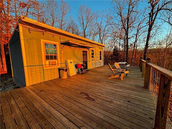 Established income-producing 40+/- acre retreat operating as a private Airbnb since 2021 with 79 guest book entries and strong online reviews. Secluded, peaceful setting with breathtaking vista views and country road frontage. The Property is fully improved with rural water, electric, fiber optic internet, propane, and septic already on site. Loaded with wildlife and ideal for deer, bear, and turkey hunting. Two RV-ready pads with electric and water lines run (hydrants/outlets needed). Exceptional location for outdoor recreation: borders Aux Gate 3 of Buffalo Wilderness Adventure Center; 7 mi to Sweden Creek Falls, 12 mi to Hawksbill Crag, 17 mi to Kings River Falls. Close to Buffalo River access (Ponca), OHT trail system, Red Star/Headwaters trails, MTB hub at Buffalo Outdoor Center, and new Walton-designed Horseshoe Canyon at Low Gap. Immediate rental income with endless recreational and future build potential.