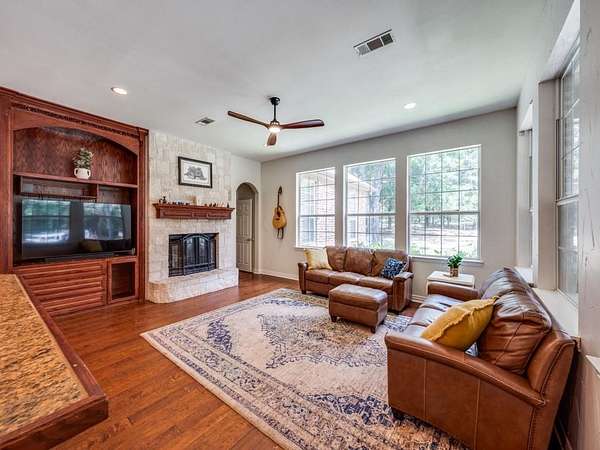 Inside, you'll find granite surfaces throughout, tall ceilings, and an open floor plan that floods with natural light. The heart of the home centers around a cozy wood-burning fireplace, ideal for gathering with family and friends. The spacious kitchen, living, and dining areas flow seamlessly, creating a warm and inviting atmosphere.