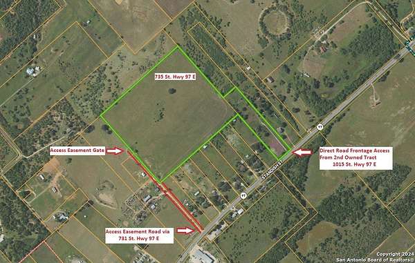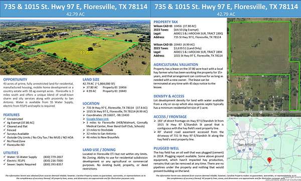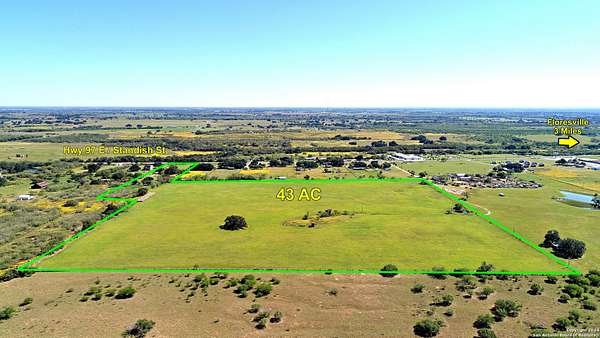 Est $4,745/mo43 acres of fully unrestricted land for residential development all offered at $15,000 per acre. The back 38 acres are currently ag-exempt and used for hay production. The front 5 acres were acquired to improve access to the overall property. Water is available from SS Water Supply, electricity from FELPS and septic is required. The gate access point is at 1015 State Highway 97 E, Floresville, TX 78114. The Google Map coordinates for the gate access point are: 29.16759, -98.13326.