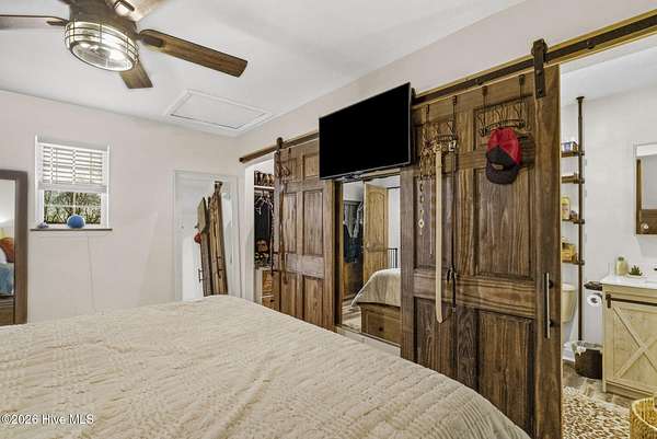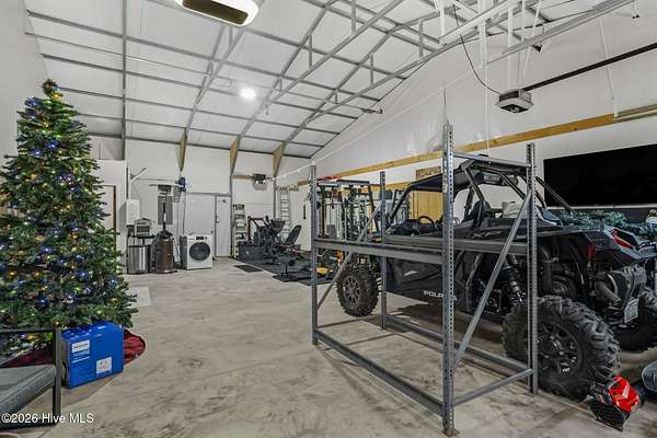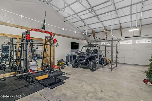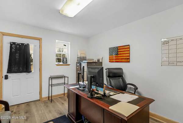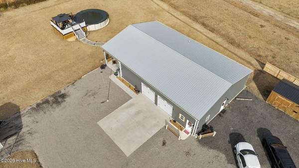 Est $1,670/moBarndominium with two separate spaces separated by oversized garage. Second space currently set up as office/business use but offers flexibility for alternative uses. Hidden safe room, solar/off-grid capability, large covered back porch.