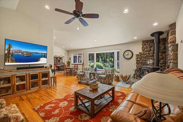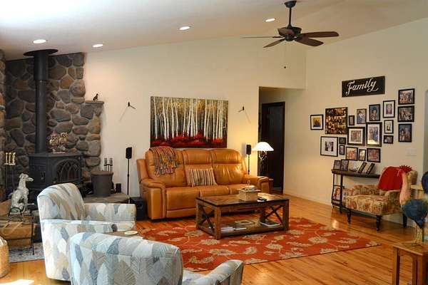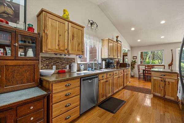 Discover the perfect blend of privacy, space, and convenience on this nearly 20-acre usable property just ~3 miles from downtown. Surrounded by mature trees and natural beauty, it offers a peaceful, park-like setting with room to live, work, and play. The home features over 3,000 sq ft of thoughtfully updated living space, including two primary suites ideal for multi-generational living, extended family, or guests. The remodeled kitchen showcases custom hickory cabinets, durable HI-MACS countertops, and generous workspace, perfect for everyday living and entertaining. Downstairs baths feature upgraded Silestone surfaces, while upstairs offers a separate living area ideal for in-law quarters or private guest space. A large 220V shop, RV parking, deer fencing, and irrigation throughout enhance versatility. New roofs on home and shop (March 2023) and a strong 26 GPM well add value. A rare opportunity for comfortable rural living close to town.