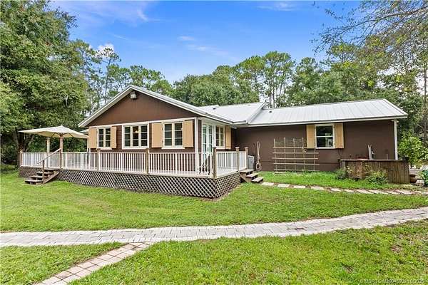 Discover your private country oasis on this picturesque 5-acre property in popular Palm City Farms. This 3-bedroom, 2-bath home with an attached 2 car garage features many updates such as a new metal roof, plank tile flooring, newer a/c condenser (2002) and newer water heaters. Enjoy outdoor living on the spacious back deck. The detached 2-bedroom, 1-bath guest house offers additional living space perfect for guests or a home office. Other features include a 2-car detached carport and an oversized 2 car detached garage. Spend peaceful afternoons fishing in the stocked pond amidst the tranquil wooded surroundings. This property offers the perfect blend of comfort and tranquility with easy access to I-95 and the Turnpike.