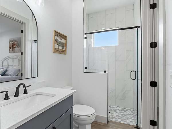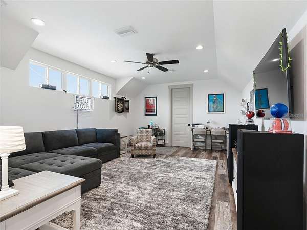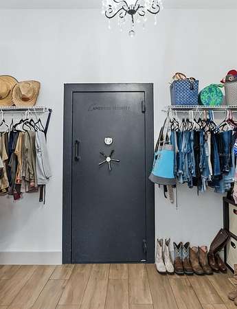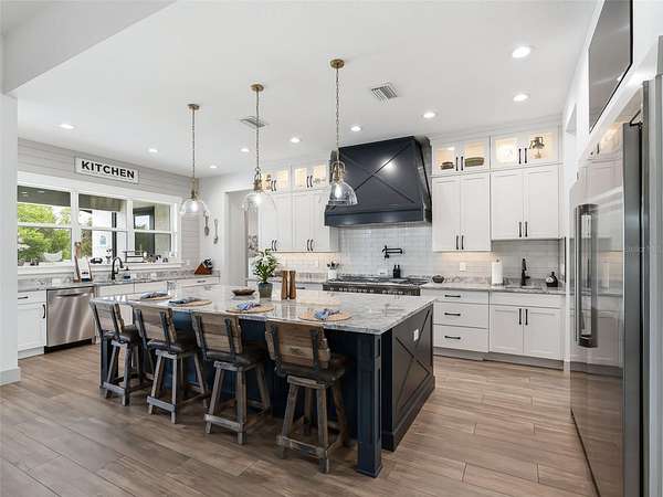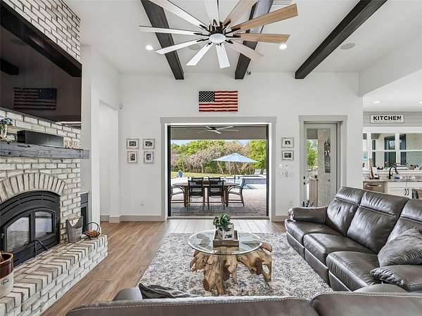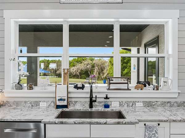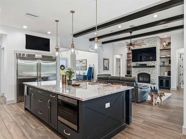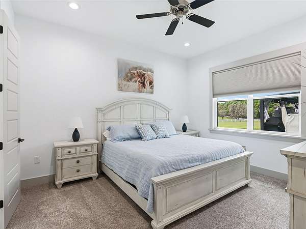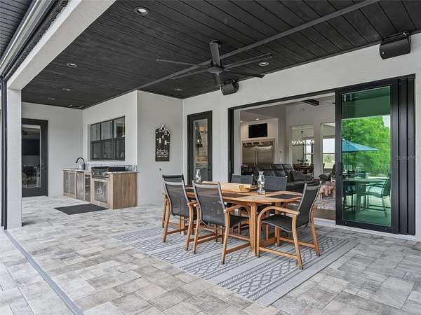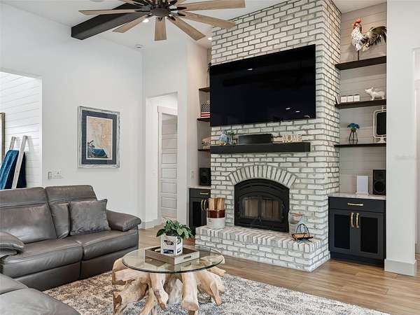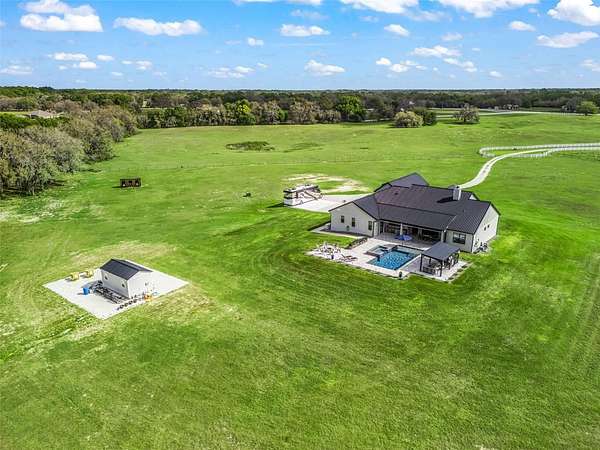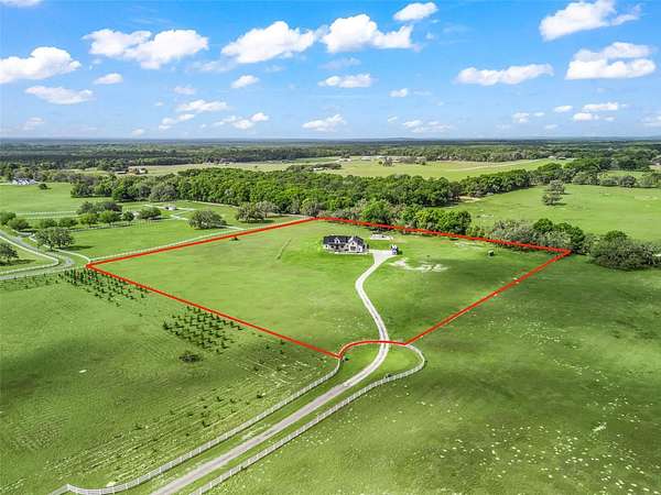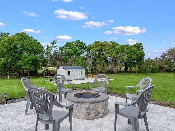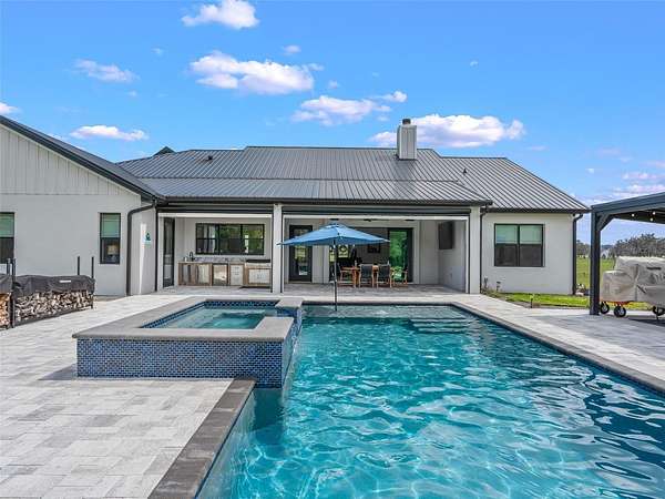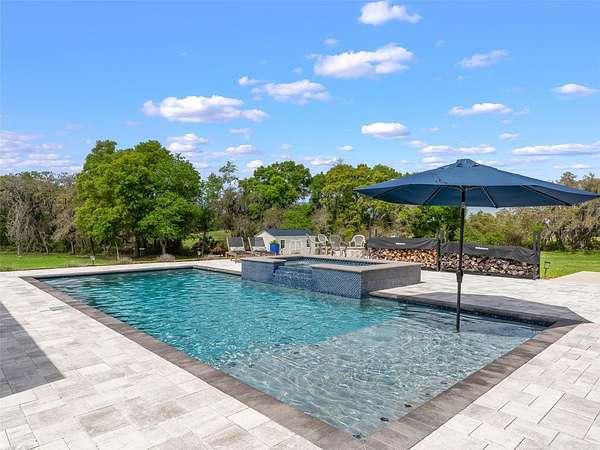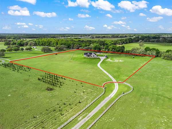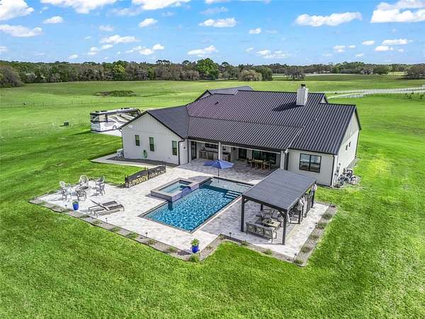 Exceptional custom home completed in December 2023 located in the gated community of Eagle Ridge Estates perched on the peak of a 10 acre cul-de-sac lot. You are welcomed by a spacious covered front porch with stained wood ceiling and columns leading to the double front door entryway. The two story foyer leads into the open floor plan boasting wood-look porcelain tile that carries throughout the main areas, tall ceilings with wood beams, a gorgeous floor to ceiling brick fireplace flanked by custom wood shelving. The open kitchen is an entertainer's dream with stunning quartzite countertops, an oversized farm sink beneath a large picture window, a 60" dual fuel range imported from Italy, commercial grade built-in fridge, additional prep sink and adjacent walk-in pantry with built-in storage and countertop with sink. The primary suite in the back of the home offers pool access, an ensuite bath with dual sinks, walk-in shower plus solid stone-resin tub, large walk-in closet and poured concrete safe room with full size vault door. The triple split plan offers two additional bedrooms with a shared bath with dual sinks and a fourth bedroom with ensuite bathroom. The upstairs, currently set up as a family room, could be a fifth bedroom with the full bathroom and a large storage room that could be a walk-in closet. There is also a half bathroom on the ground floor, full laundry room and attached oversized and insulated 3 car garage. In the back of the home, the outdoor oasis is accessed through triple pocketing sliders, and is sure to be a family favorite spot with a spacious covered area with outdoor kitchen and roll down screens, and paver deck that leads to the pool. The saltwater pool features a waterfall spa and overlooks the gorgeous farmland. There is a large shed in the back designed to match the home and an adjacent shooting range with a custom designed backstop. Additional features include: 22kw whole-home standby generator, 1,000 gallon owned and buried propane tank, 400 amp service, metal roof on home and shed, icynene spray foam insulation, security and camera systems, solid core interior doors, high-end Delta, Kohler and Rohl fixtures, faucets and sinks, custom woodwork throughout, recessed lighting throughout, built-in speakers, water treatment system, commercial grade irrigation system around the home, and impact glass windows and doors. Eagle Ridge Estates welcomes horses, animals, barns and RVs. This property also boasts direct access to trails into Withlacoochee State Forest non-motor trails. Furniture and equipment is also available including a tractor and zero turn mower!