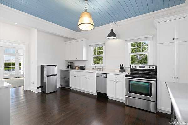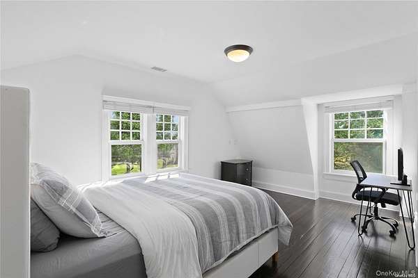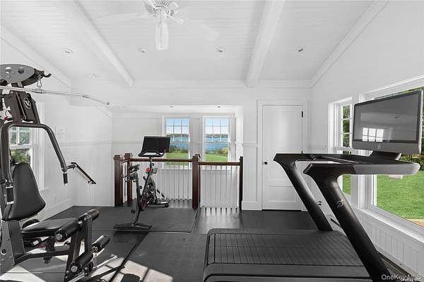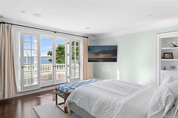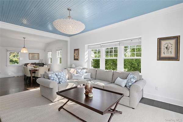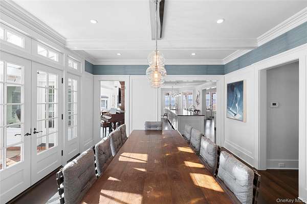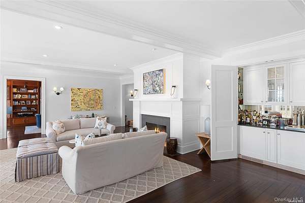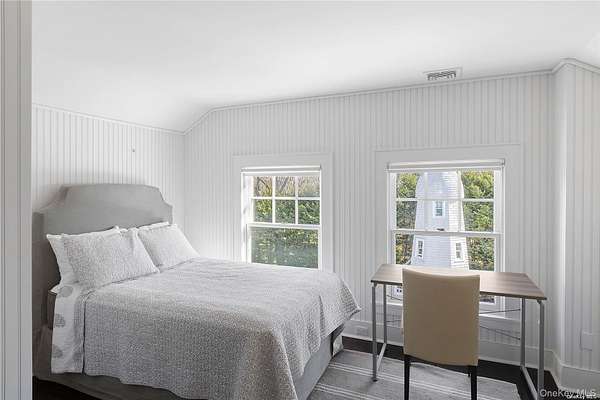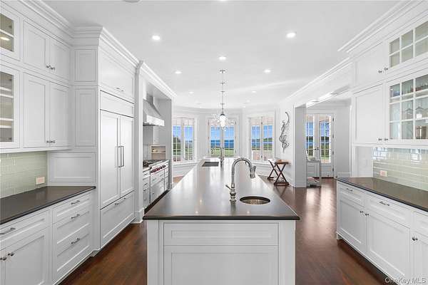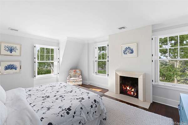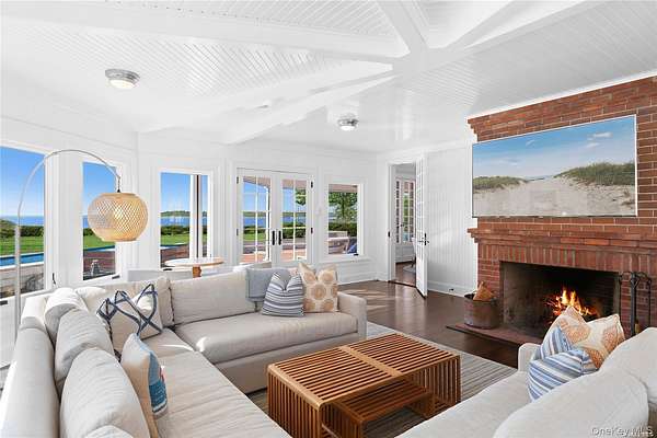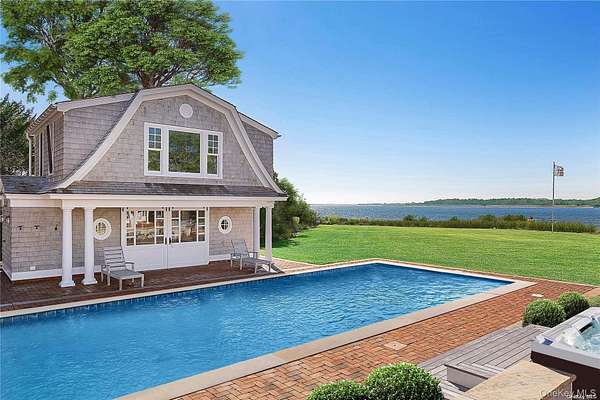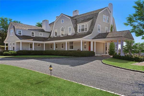 This majestic, one-of-a-kind estate is set on 4+ private, resort-like acres in the Town of Southampton. Its unique location on the southwest-facing waterfront provides incredible sunset views over Seatuck Cove and Moriches Bay from large windows throughout the bright, airy main residence. Perfect for entertaining, the meticulously updated 9-bedroom, 9.5-bath main home features a chef's kitchen with granite countertops, Wolf stove, dual ovens and dishwashers, and a 17-foot island. There's a living room with a built-in bar and wood-burning fireplace, a dining room, family room, handsome library and sunroom with wood-burning fireplaces, and a temperature-controlled wine cellar; and French doors lead to an ample patio overlooking the water. The primary bedroom has dual closets, custom built-ins, a bathroom with radiant floor and dual vanities, and a porch with sweeping water views. A former 19th century hunting lodge, the home blends old world charm with modern-day amenities, including an elevator and state-of-the-art mechanical systems, and features a porte cochere for shelter when getting in and out of vehicles. The sprawling property, which is bordered by tall perimeter trees and accessed through a gated entrance, includes a four-bedroom guest house with full kitchen; a detached five-car garage with commercial-grade hydraulic car lifts; a charming, refurbished, old-fashioned windmill; and a pool house with sauna, and gym overlooking the 45x20 heated saltwater gunite pool. A sweeping, lush lawn extends down to 234 feet of waterfront, where there are docks, a sandy beach and a boathouse. Har-tru tennis courts complete the country club experience. There's little reason to ever leave!