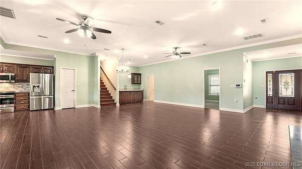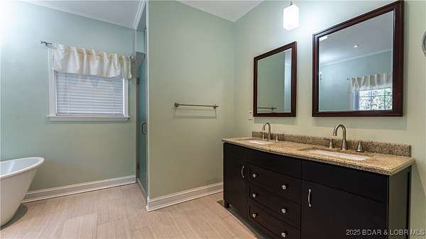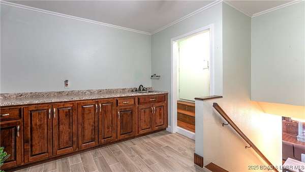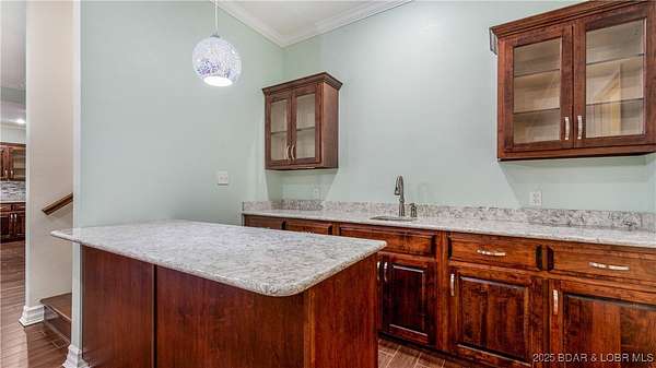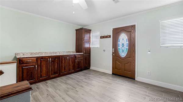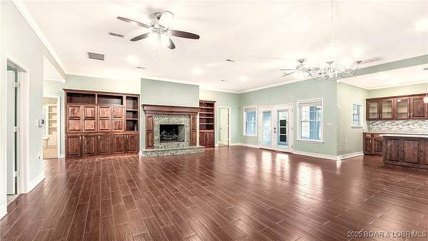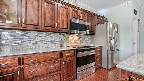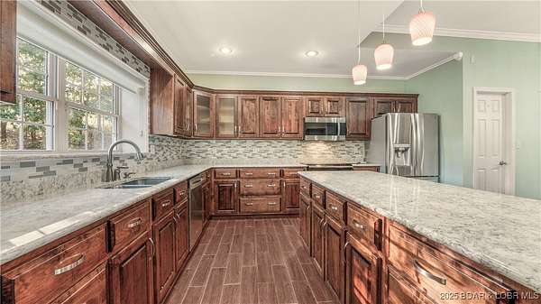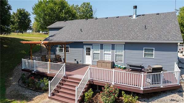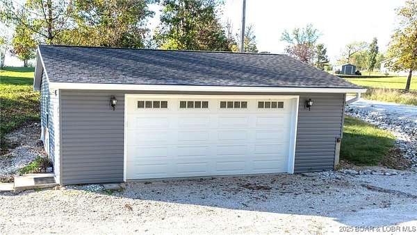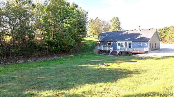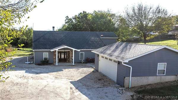 PEACEFUL LOCATION and OUTSTANDING CRAFTSMANSHIP - This beautiful country home was constructed with utmost attention to design and quality, with Roof, Gutters and Siding NEW in 2024. The charming covered porch offers great curb appeal, and the tall ceilings and open design create an inviting central living area with a gas fireplace, adorned by custom built-ins as a focal point. Attractive and durable wood-look tile runs through the Living, Kitchen, Dining and Wet Bar. The gorgeous kitchen offers a large island w/ counter seating, tons of custom cabinetry, granite counters, stainless appliances and large walk-in pantry. The enormous Master Suite includes a spa-like bathroom w/ custom dual vanity w/granite, luxurious soaking tub, and walk-in shower, while the immense walk-in closet offers "his and hers" division. The second bdrm is enhanced by custom built-in storage/shelves. The upper level houses the laundry, loads of cabinets and a massive walk-in storage/mechanical room. The 4seasons sunroom opens to a large deck with arbor-covered dining overlooking the vast back yard, and the property includes an oversized 2 car garage/shop. Located only minutes from all Camdenton conveniences.