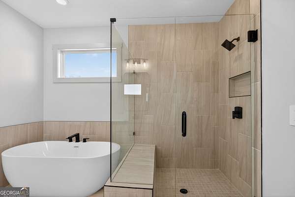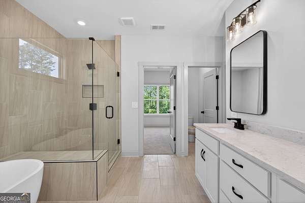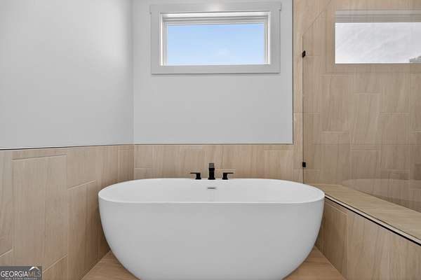 - Beamed Ceilings, Double Vanity, High Ceilings, Master On Main Level, Separate Shower, Soaking Tub, Split Bedroom Plan, Tile Bath, Tray Ceiling(s), Vaulted Ceiling(s), Walk-In Closet(s)