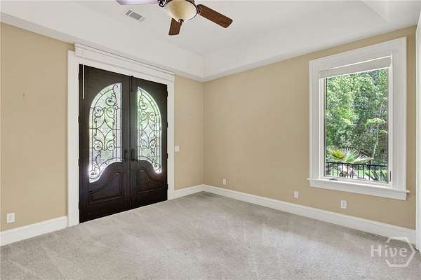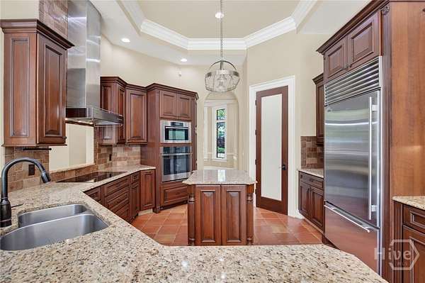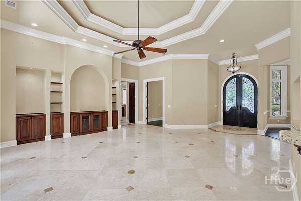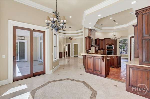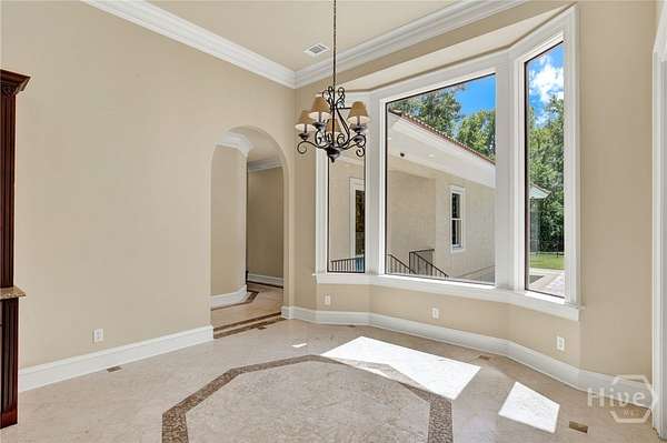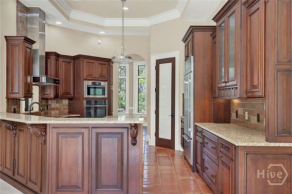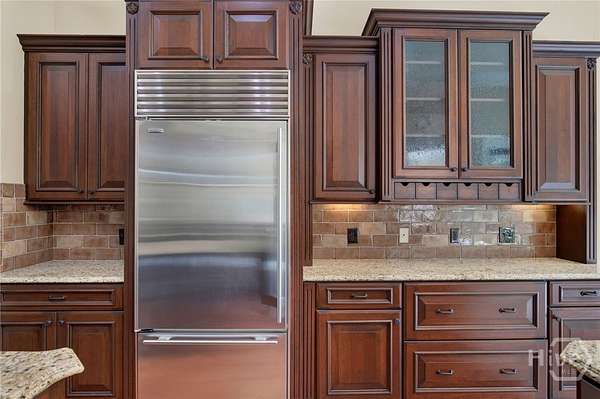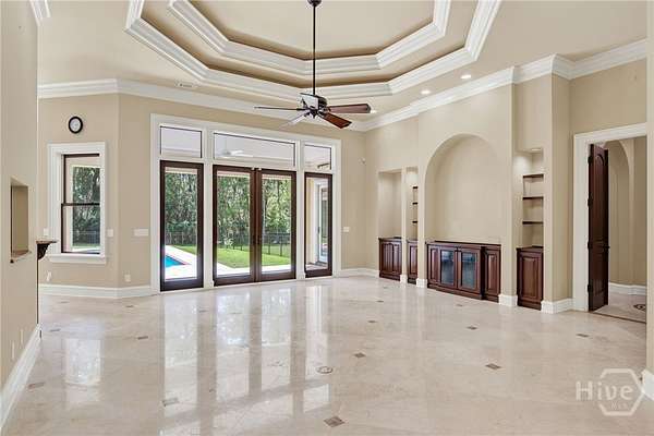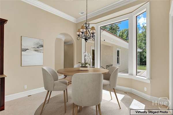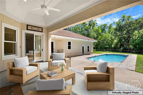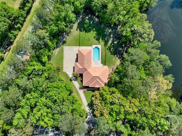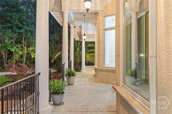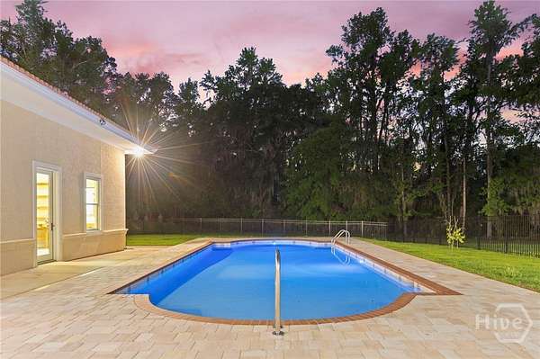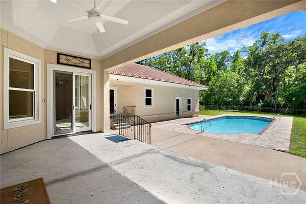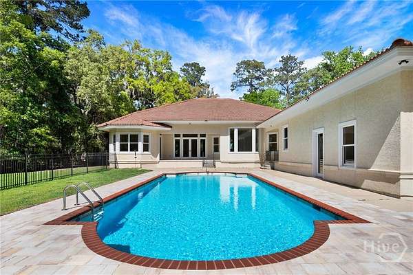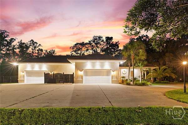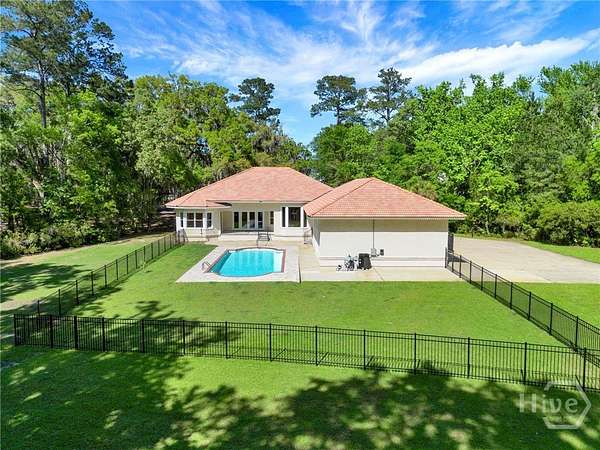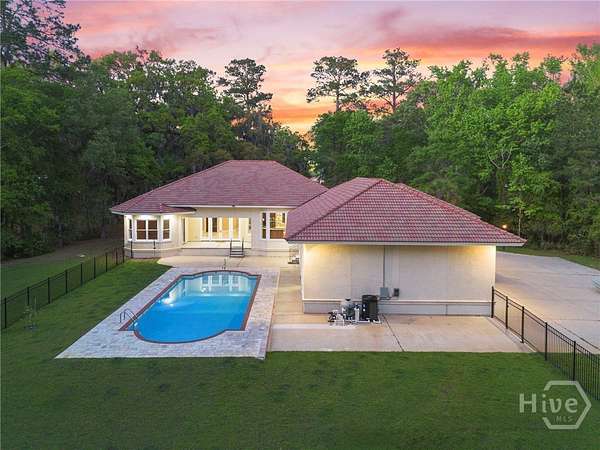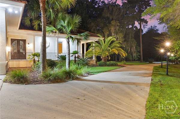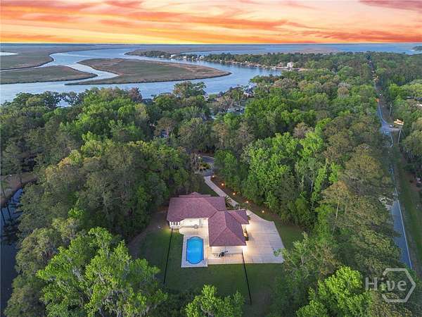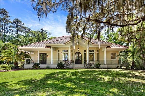 Tucked away at the end of a quiet cul-de-sac on 1.87 acres, this one-of-a-kind retreat blends Mediterranean Coastal architecture with timeless Lowcountry influences. A striking stucco exterior with a classic clay tile roof is set beneath moss-draped oak trees, creating a setting that feels both elegant and serene. Overlooking a tranquil lagoon, the property offers a true escape-just moments from Fish Tales and Fort McAllister Marina. Inside, the home features four bedrooms, 2.5 bathrooms, and a dedicated office, all thoughtfully arranged in a split floor plan for maximum privacy. Soaring 1012' ceilings, expansive windows, 8' solid mahogany doors, travertine flooring, and dramatic stone accent walls create a warm yet sophisticated interior. The kitchen is designed for both everyday living and entertaining, offering granite countertops, a large pantry, induction cooktop, and Sub-Zero refrigerator. The breakfast area overlooks the pool, creating a seamless connection between indoor and outdoor living. The spacious owner's suite enjoys peaceful lagoon views and features a spa-like bath with a large stone shower, rain head, and dual vanities. Each bedroom offers its own exterior access, enhancing the home's connection to its natural surroundings. The oversized fourth bedroom-with custom built-ins-provides flexibility for guests, hobbies, or additional workspace. Step outside to your private backyard oasis, where the expansive covered patio overlooks an 18' x 36' heated saltwater pool (installed in 2025) with elegant fountains, offering the perfect setting for relaxing or entertaining year-round. A shallow well provides irrigation for the grounds, helping maintain the lush landscape efficiently. Additional highlights include a tankless water heater and a four-car garage with epoxy floors, and abundant storage. This is more than a home-it's a private retreat designed for those who appreciate thoughtful design, privacy, and the beauty of coastal living.